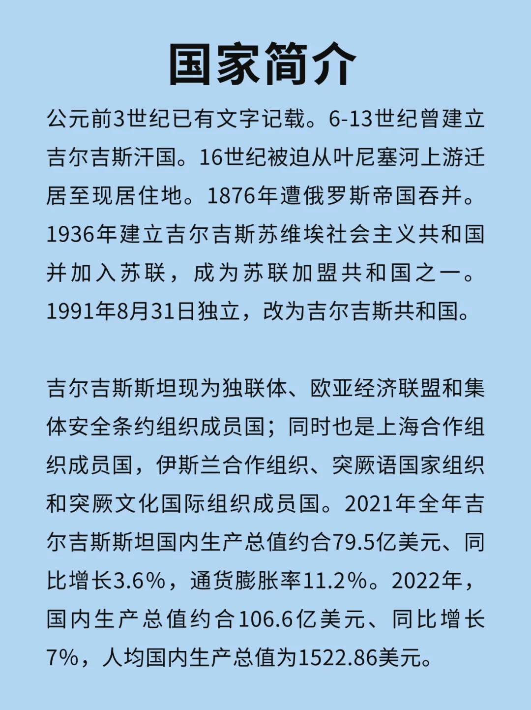 [种草R]2021年全年吉尔吉斯斯坦国内生产总值约合79.5亿美元、同比增长3.6%,通货膨胀率11.2%。2022年,国内生产总值约合106.6亿美元、同比增长7%,人均国内生产总值为1522.86美元。