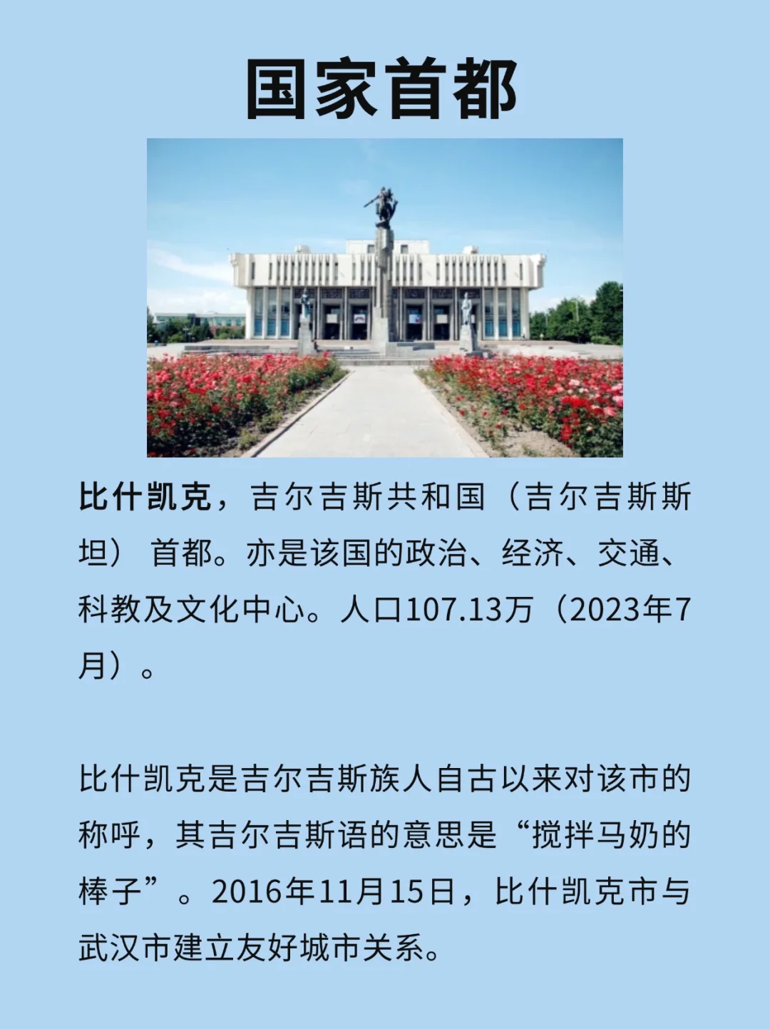 [彩虹R]比什凯克是吉尔吉斯斯坦的首都和最大城市。吉尔吉斯斯坦现为独联体、欧亚经济联盟和集体安全条约组织成员国;同时也是上海合作组织成员国,伊斯兰合作组织、突厥语国家组织和突厥文化国际组织成员国。