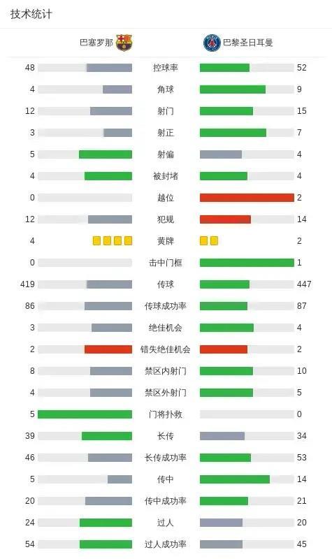 五大主力缺阵的大巴黎2:1逆转巴萨,让心高气傲的西甲冠军输的心服口服! 赛后统计