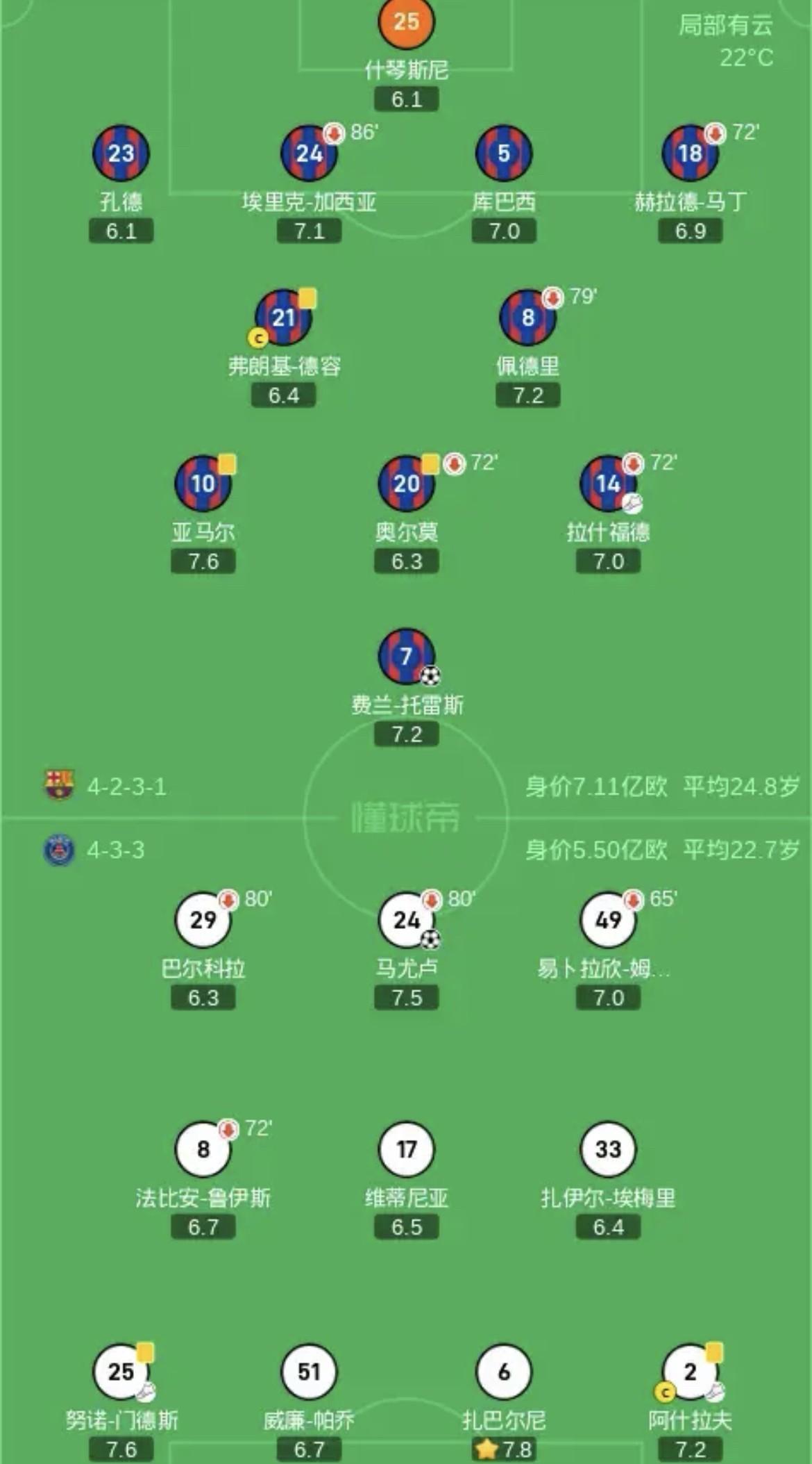 五大主力缺阵的大巴黎2:1逆转巴萨,让心高气傲的西甲冠军输的心服口服! 赛后统计显示,大巴黎在各项数据上全部领先巴萨,不管是控球率、传球次数,还是射门的数量,绝佳机会的数量,巴萨全部落后。 更让巴萨粉丝难受的是,今天输球还是建立在全主力巴萨主场对阵的是残血巴黎的基础上,大巴黎前场主力三叉戟登贝莱克77杜埃全部因伤缺阵,中场也少了一个搅屎棍内维斯,后防线的队长马尔基尼奥斯也不在场,大巴黎连五成功力都没拿出来,巴萨还是踢不过! 上赛季国米在主场逆转巴萨后,巴萨的球迷还认为自己错失了欧冠冠军,但在本场比赛之后。巴萨铁杆只会庆幸,是国米替自己在欧冠决赛被屠杀。如果巴萨上赛季欧冠决赛去踢巴黎,以大巴黎的水平和能力,被血洗的将是红蓝军团。