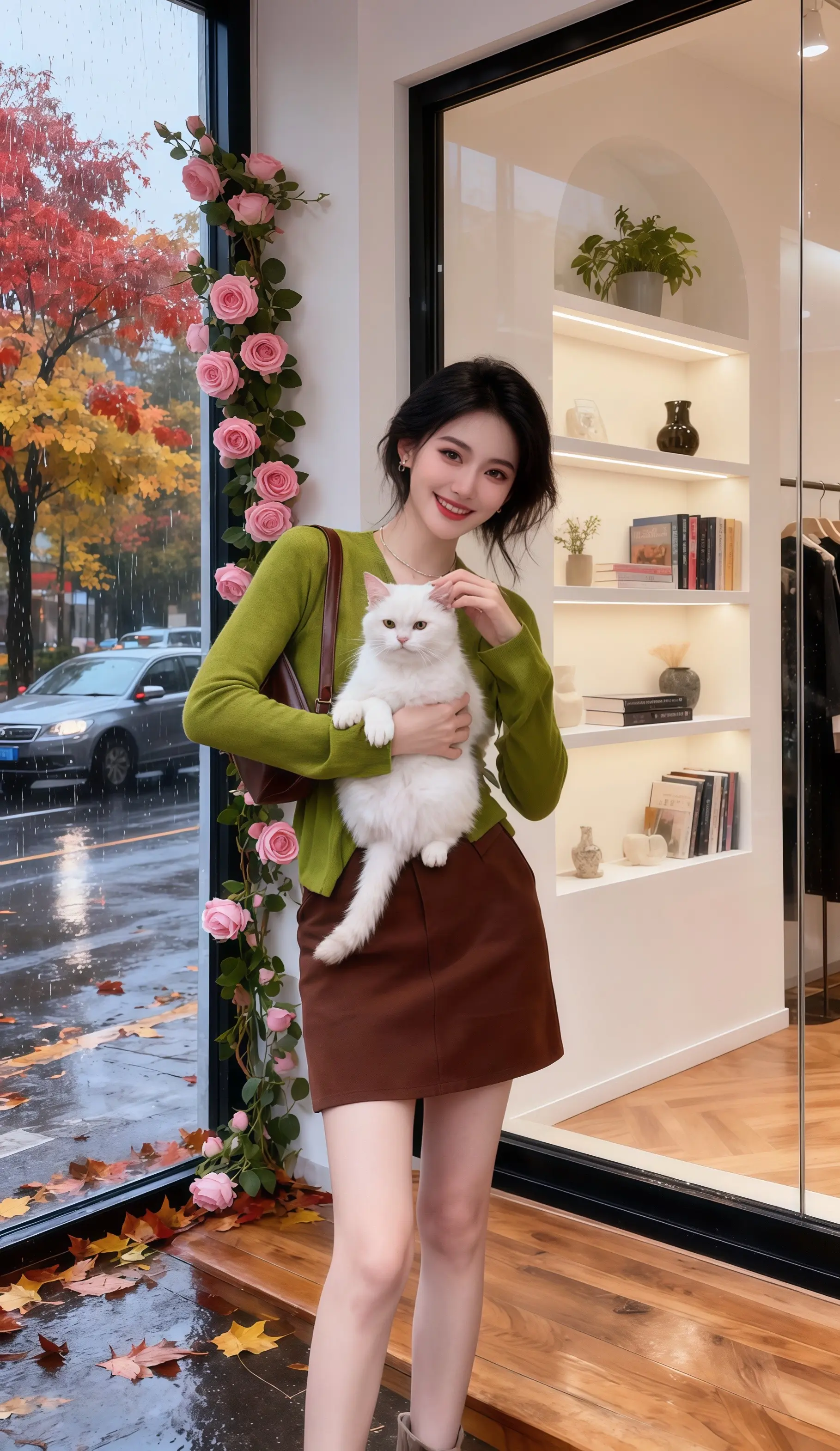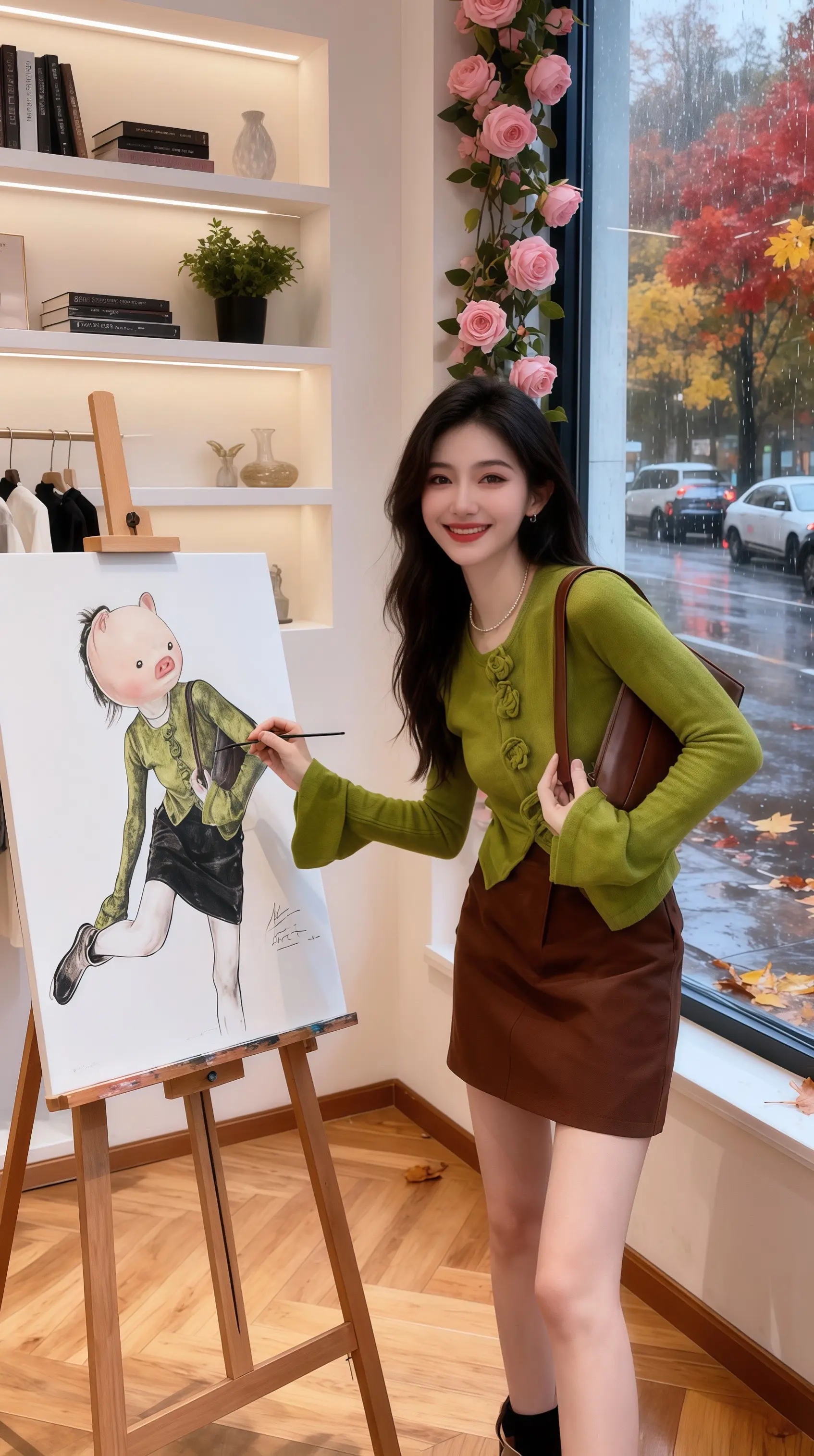 入秋后的第一个惊喜,是这套带着“小玫瑰”的穿搭给的。 初见它时,那抹清新的橄榄绿针织开衫就很吸睛,立体玫瑰扣像把花园别在了身上,喇叭袖一抬手都是温柔感。搭配深棕短裙,复古又显白,挎上棕色包包,往店里一站,连窗外的秋雨和彩叶都成了背景。 穿上它出门,走在湿漉漉的街道上,晚风掠过喇叭袖,感觉自己既明媚又别致。这种把浪漫穿在身上的感觉,大概就是秋日穿搭里的小确幸吧。