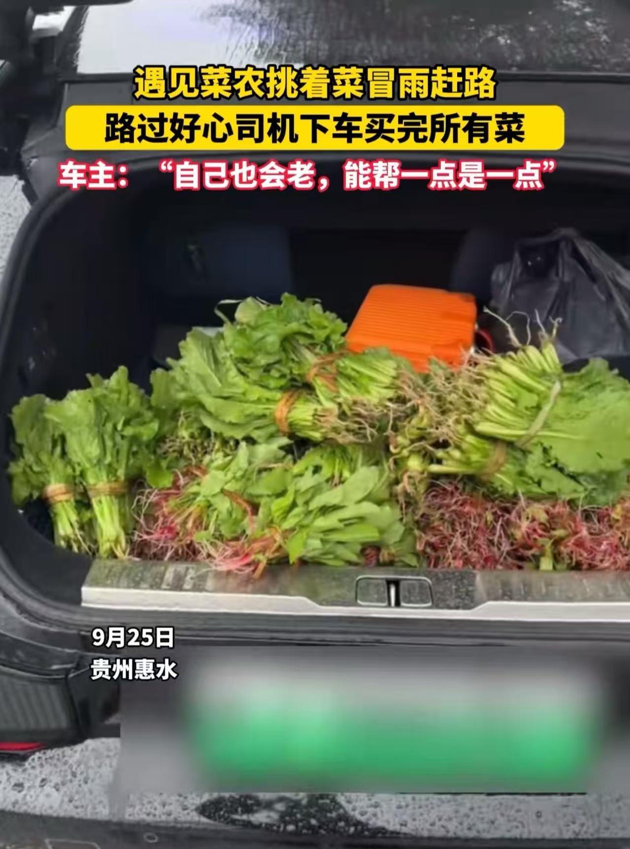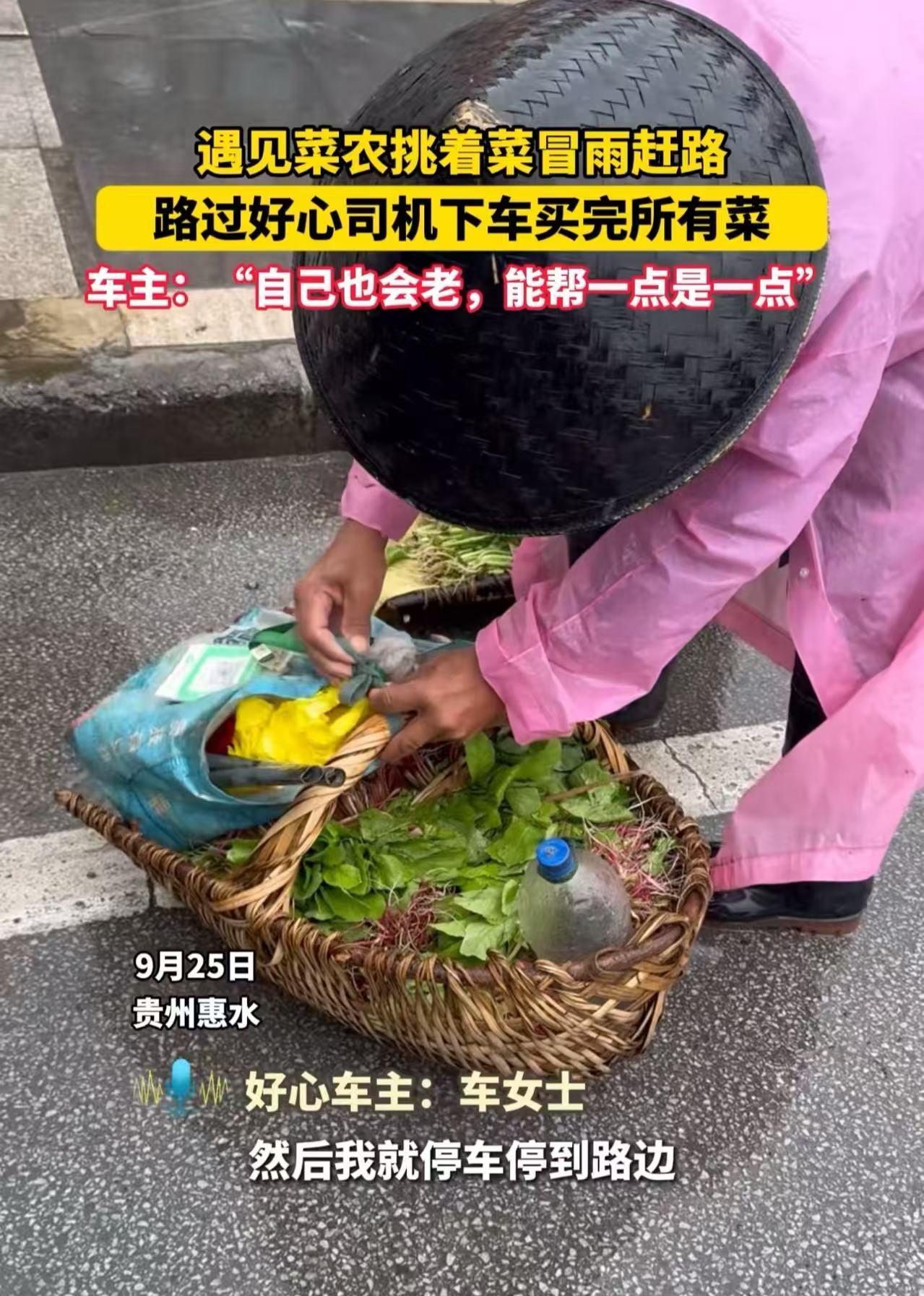 看哭了!贵州惠水,女司机遇见菜农挑着菜冒雨赶路,走路还一瘸一拐,一口气买下菜农所有的菜!女司机:“我自己也会老,能帮一点是一点!”网友:往后老人一定会一遍又一遍地说起那个雨天,有辆车上走下来一位善良的女士! 这天,车女士开着车出门,在等红绿灯的间隙,她不经意地往旁边一瞥,目光瞬间被一位老人吸引住了。 只见老人用那略显单薄的扁担,挑着沉甸甸的菜筐往集市里赶。 此时,天空正下着瓢泼大雨,老人虽然穿着雨衣,戴着斗笠,但雨水还是顺着帽檐不停地往下流,打湿了他的衣衫。 更让人揪心的是,老人走路一瘸一拐的,每一步都显得那么吃力。 车女士的心一下子就被揪紧了,一股心酸涌上心头。她仔细端详着老人,那布满皱纹的脸庞、佝偻的脊背,都在诉说着岁月的沧桑。 在车女士看来,这个年纪的老人本应该在家安享晚年,享受着子孙绕膝的天伦之乐。 可是,现实却是残酷的,农村的老人大多没有养老金,为了生活,他们不得不在这个本该颐养天年的年纪,依然下地劳作,靠自己的双手养活自己。 车女士心疼老人,想着要是能把老人的菜都买下来,老人就能早点回家,不用再在这冰冷的雨中受苦了。 于是,她毫不犹豫地下车,朝着老人走去。 当她走近一看,发现这些菜比她预想的还要新鲜,都是老人自己精心种植的,一大早起来摘的,只是刚摘完就碰上了这场大雨。 车女士说:“老人家,您这些菜我都买了。” 老人一听,顿时受宠若惊,一个劲儿地要给车女士便宜点。 车女士却紧紧握住老人的手,坚持要多给老人一些钱,她心疼地说:“大爷,您这么不容易,这点钱不算什么。” 最后,老人开心地离开了。而车女士看着后备箱里装得满满当当的菜,心里也涌起一股暖流。 虽然这只是一件微不足道的小事,但车女士觉得,能够帮助到老人,让她一整天都感到无比的开心。 在这个常常被功利和冷漠笼罩的世界里,车女士的这一善举就像一道璀璨的光,照亮了人性的美好。 她的爱温暖了自己,也感动了我们!这种善良,无关乎金钱的多少,无关乎地位的高低,它是一种发自内心的对他人的关怀和帮助。 让我们为车女士点赞,愿这样的善举能够像星星之火,点燃更多人心中的善良,让这个世界变得更加美好!