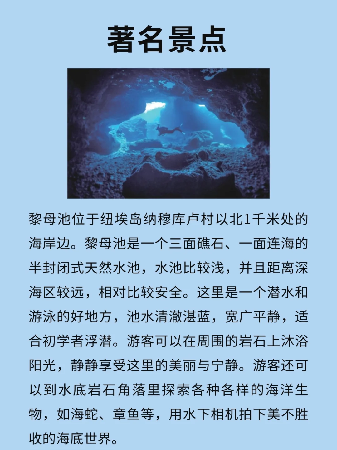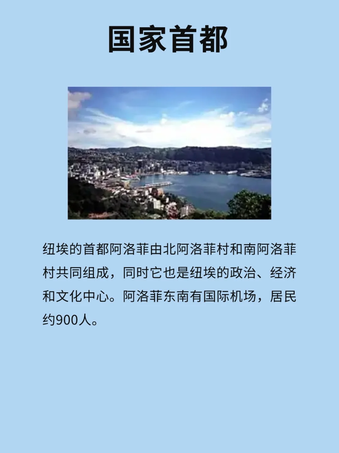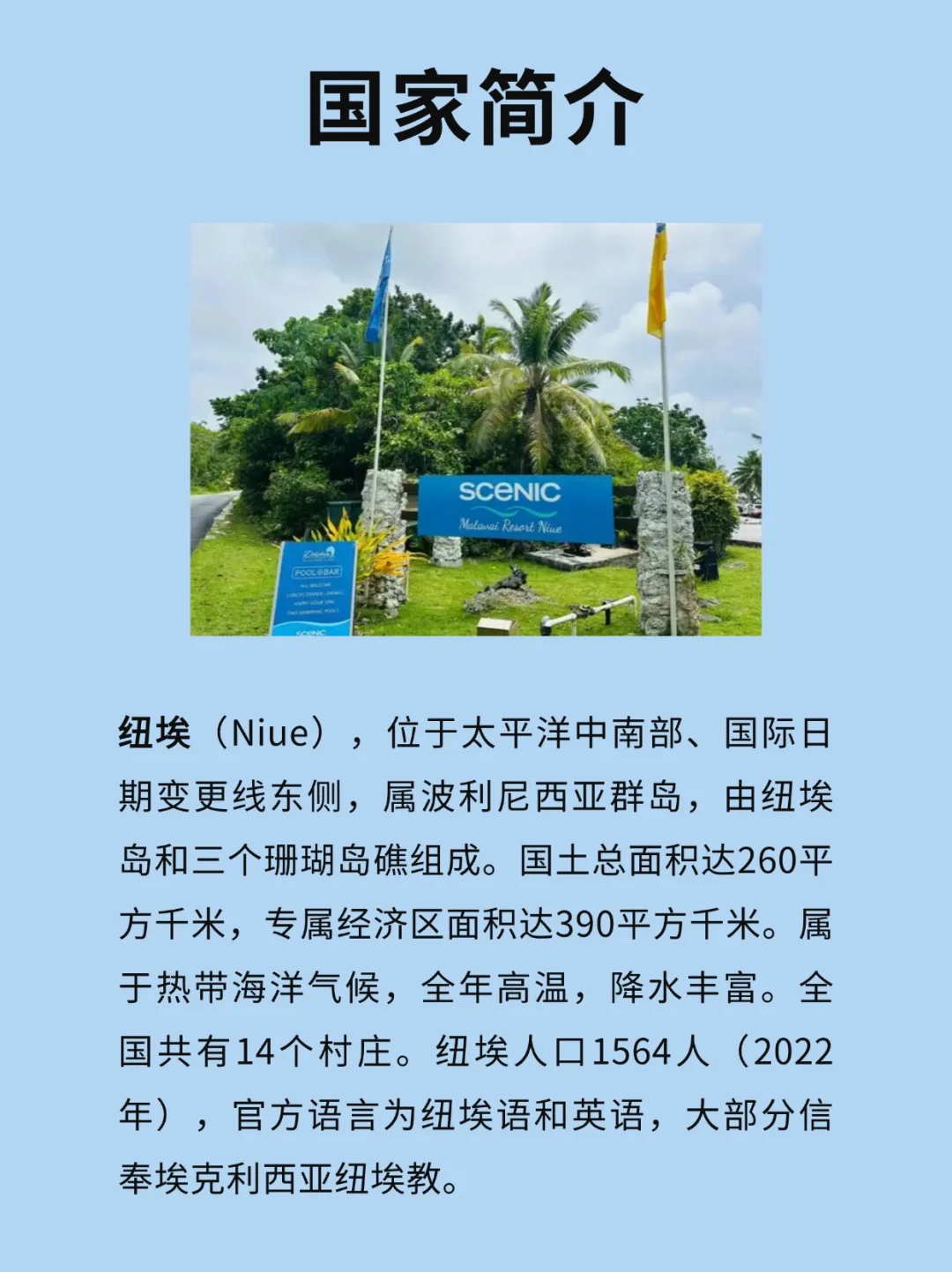 纽埃(Niue),位于太平洋中南部、国际日期变更线东侧,属波利尼西亚群岛,由纽埃岛和三个珊瑚岛礁组成。国土总面积达260平方千米,专属经济区面积达390平方千米。属于热带海洋气候,全年高温,降水丰富。全国共有14个村庄。纽埃人口1564人(2022年),官方语言为纽埃语和英语,大部分信奉埃克利西亚纽埃教。