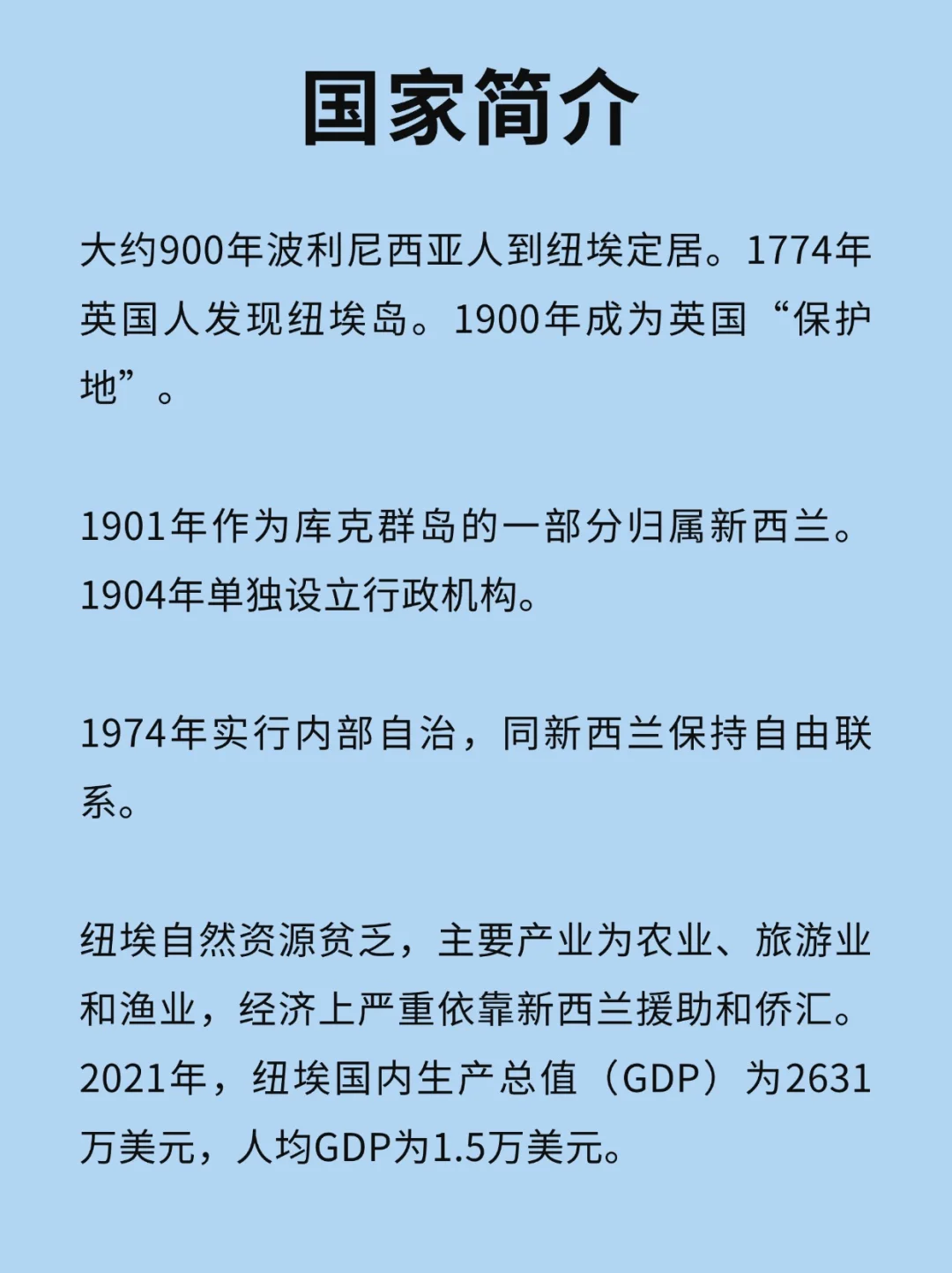 [私信R]大约900年波利尼西亚人到纽埃定居。1774年英国人发现纽埃岛。1900年成为英国“保护地”。1901年作为库克群岛的一部分归属新西兰。1904年单独设立行政机构。1974年实行内部自治,同新西兰保持自由联系。