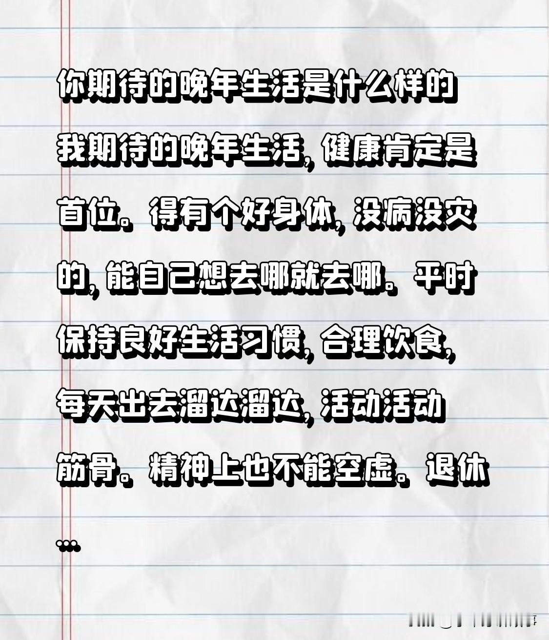 你期待的晚年生活是什么样的我期待的晚年生活,健康肯定是首位。得有个好身体,没病