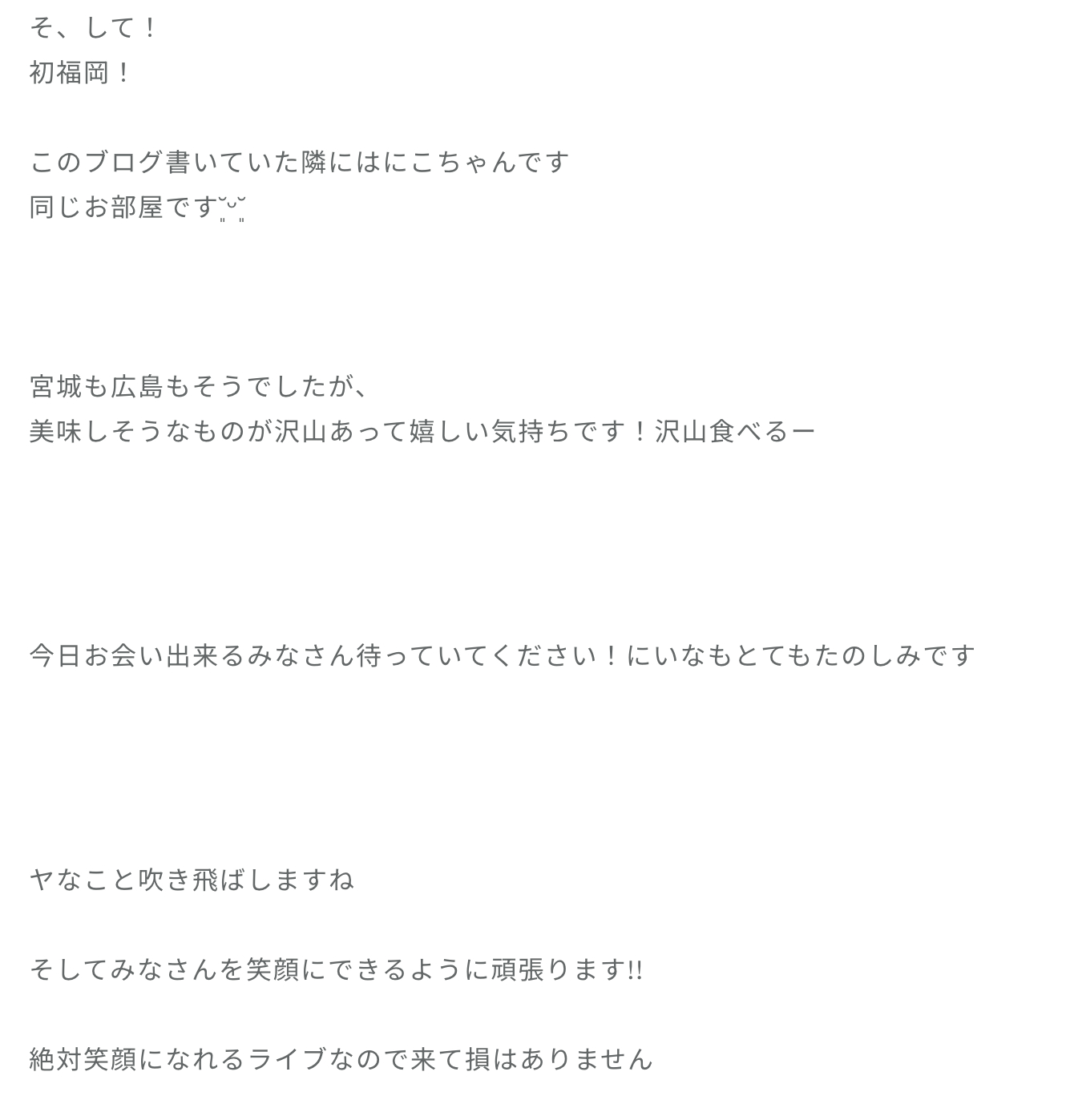 坂井新奈「福岡1日目も本当にありがとうございました!ツアーが始まってもう折り返し地点とお聞きして、はやい!少し寂しいような気持ちもあります。でも残りも大切に沢山楽しみます!」