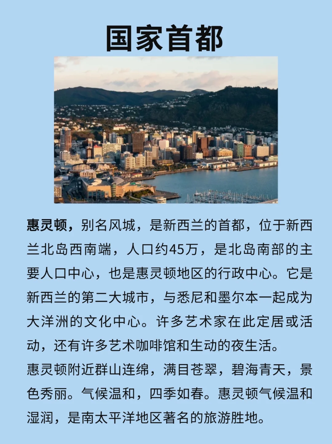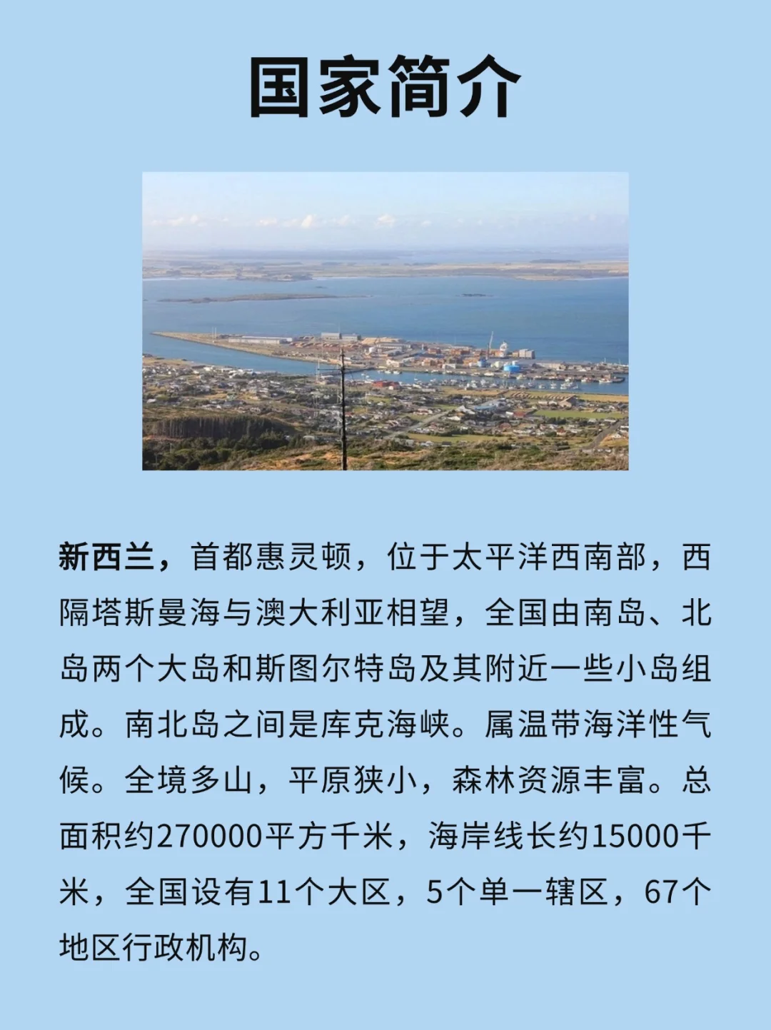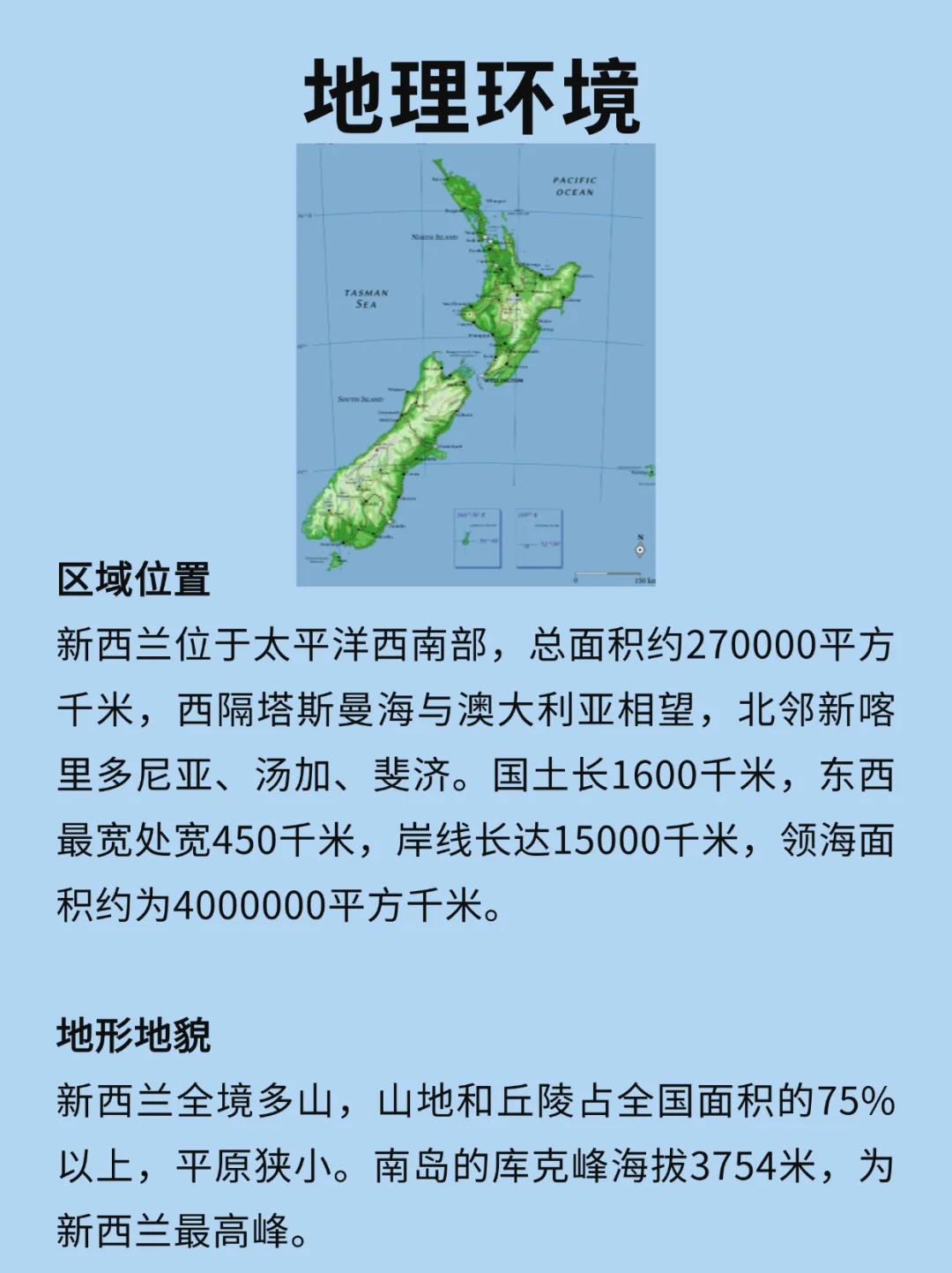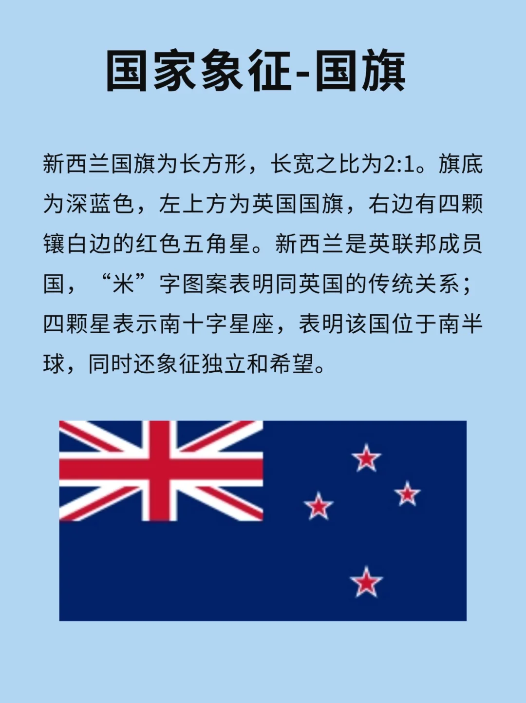 新西兰,首都惠灵顿,位于太平洋西南部,西隔塔斯曼海与澳大利亚相望,全国由南岛、北岛两个大岛和斯图尔特岛及其附近一些小岛组成南北岛之间是库克海峡。 [打卡R]新西兰位于太平洋西南部,总面积约270000平方千米,国土长1600千米,东西最宽处宽450千米,岸线长达15000千米,领海面积约为4000000平方千米。 新西兰国旗为长方形,长宽比列为2:1。旗底为深蓝色,左上方为英国国旗,右边有四颗镶白边的红色五角星。新西兰是英联邦成员国,“米”字图案表明同英国的传统关系。