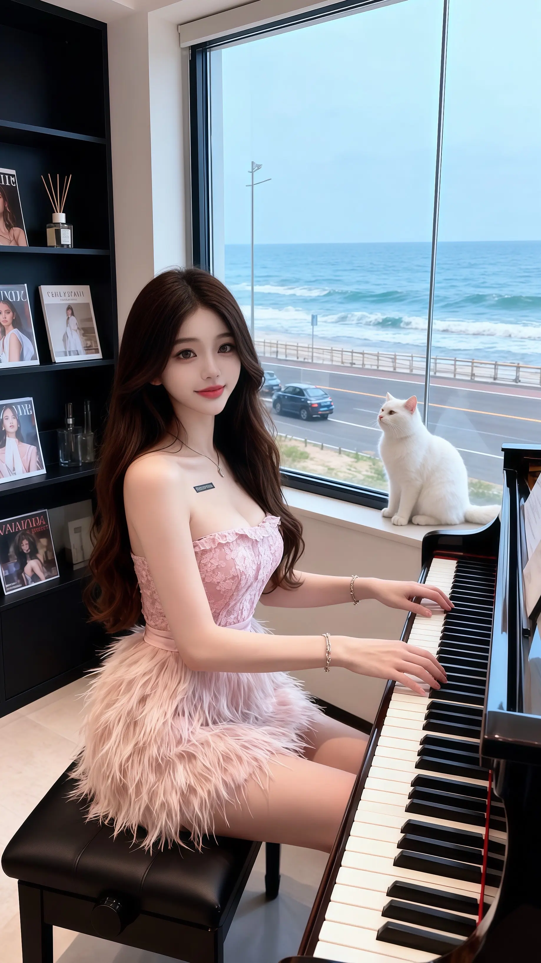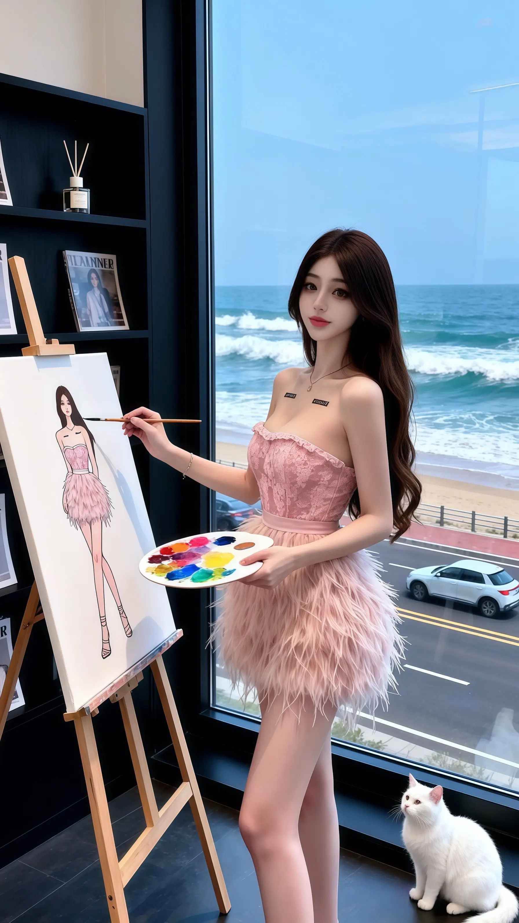 窗边的白猫轻轻“喵”了一声,圆溜溜的眼睛盯着裙摆,仿佛也在为这份柔美心动。
