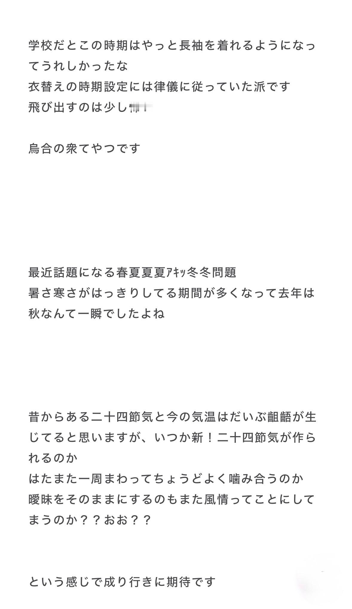 大越ひなの「秋に抗いたいよー。時間経つの怖いよー。最近上向いたり下向いたりしながら街を闊歩してますが、ぽつぽつと飲食店の店先にテーブルが置かれるようになっていて、軒先でご飯食べれる気温…これはもう抗えない秋来ちまったなぁと思てり。」 ​​​