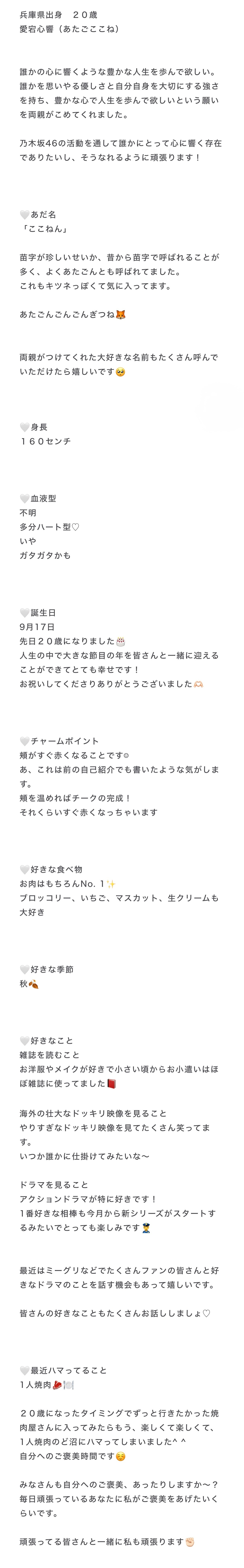 愛宕心響「本日から個人ブログがスタートし、改めて自己紹介をしたいと思います!とはいうもののリレーブログの初回で自己紹介をしていたので見返してみようとは思ったのですが、ちょっと恥ずかしくて開けなかったです。というわけで最新の私の自己紹介🙌🏻前と変わってるかな〜🤔」