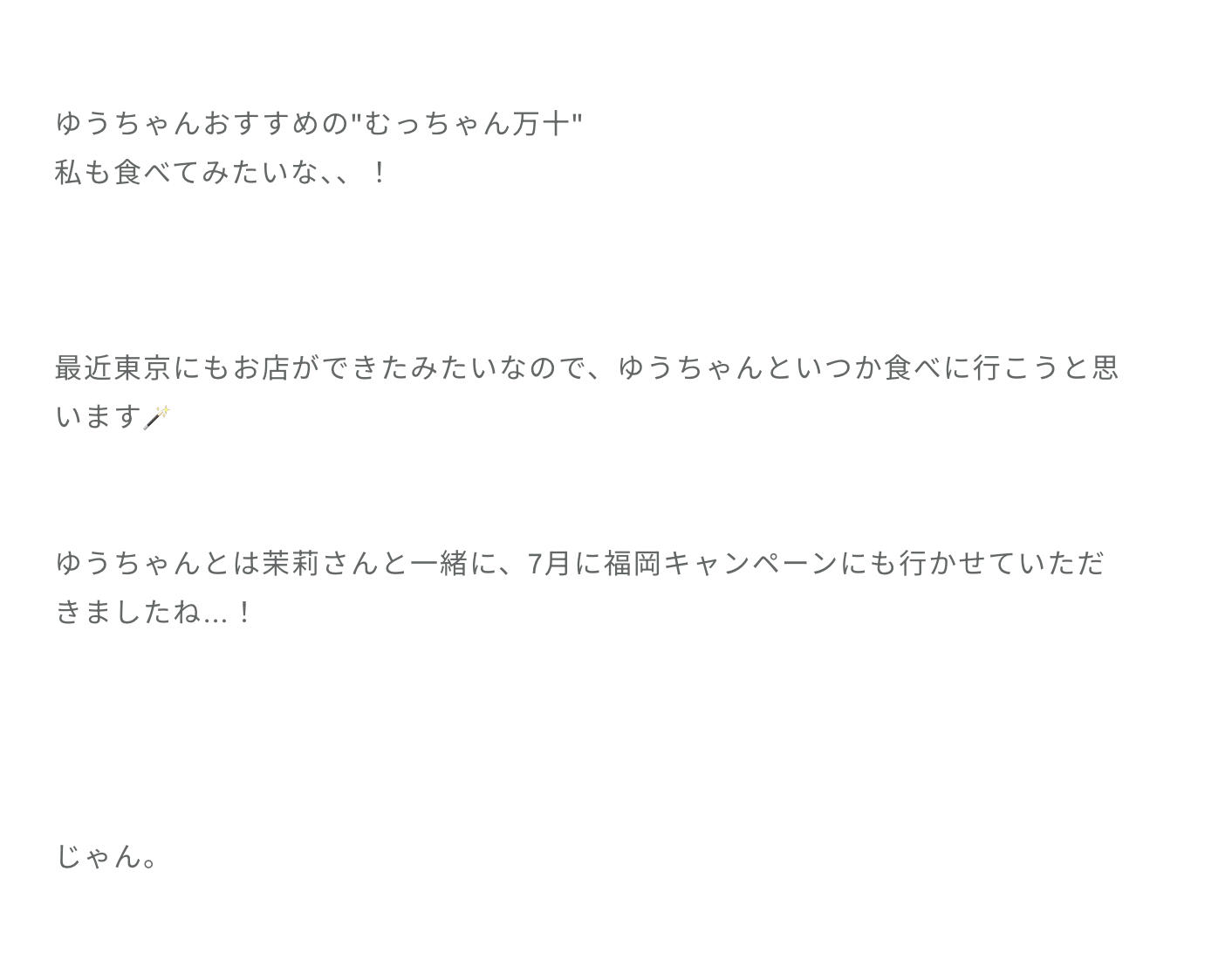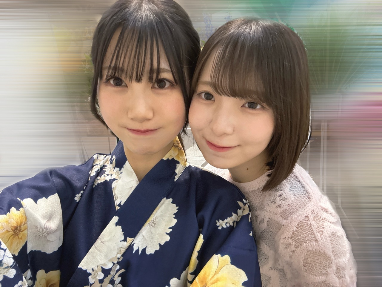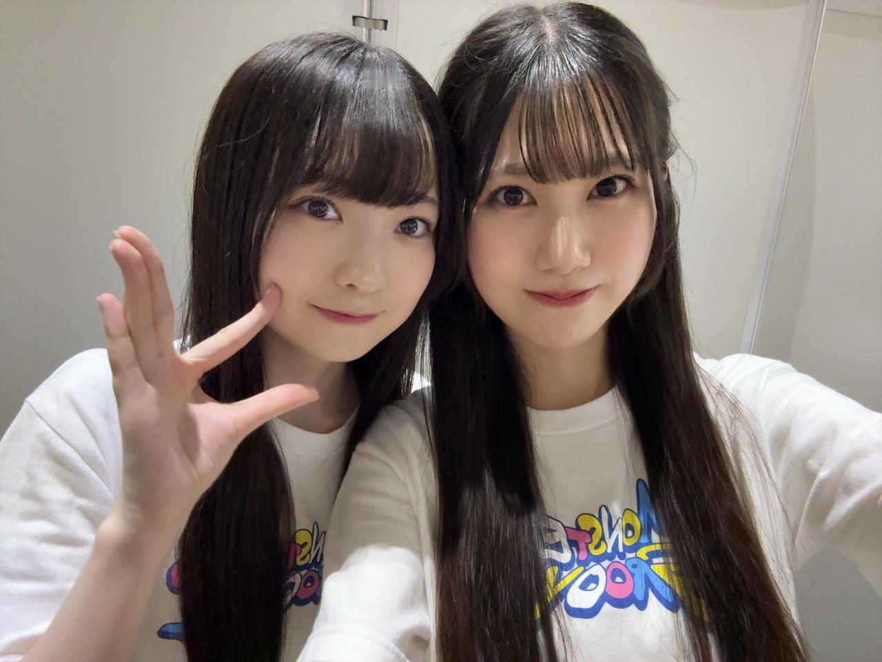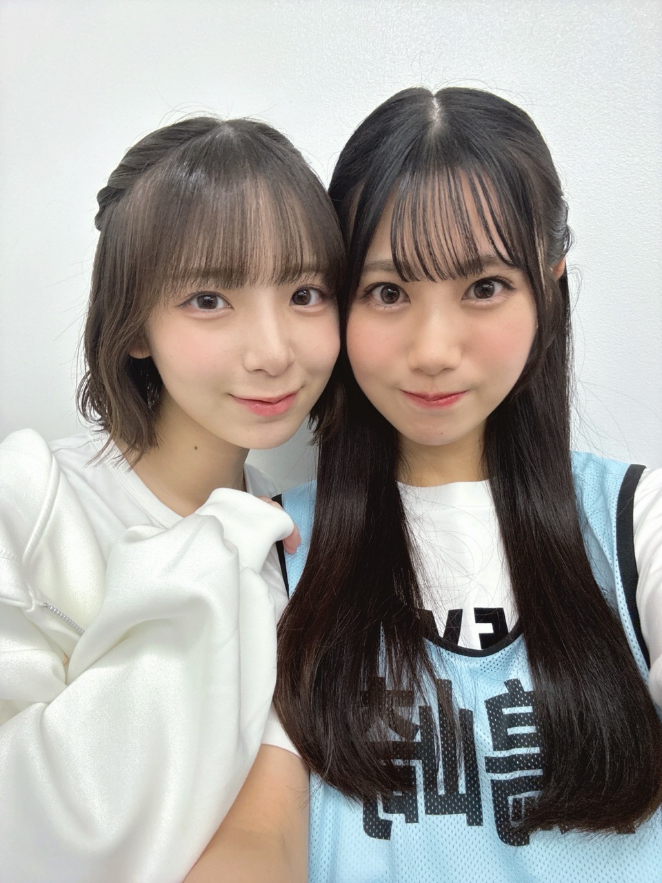 鶴崎仁香「今日のご飯は何にしようかな~~ラーメンも水炊きも明太フランスも、、きになります!!!福岡のご飯ってしあわせすぎるね🍚そして福岡といえば、、、?福岡県出身のお二人が思い浮かびますよね💭そう!渡辺莉奈さんと佐藤優羽ちゃんです…‼︎ということで、今日はまずりなさんとのお写真~!📸」