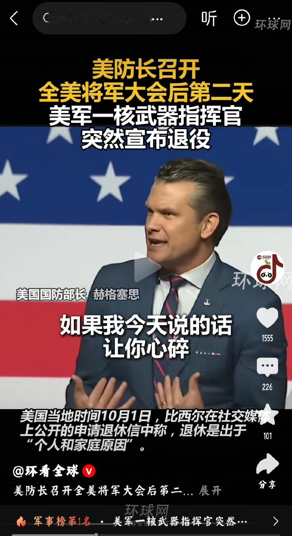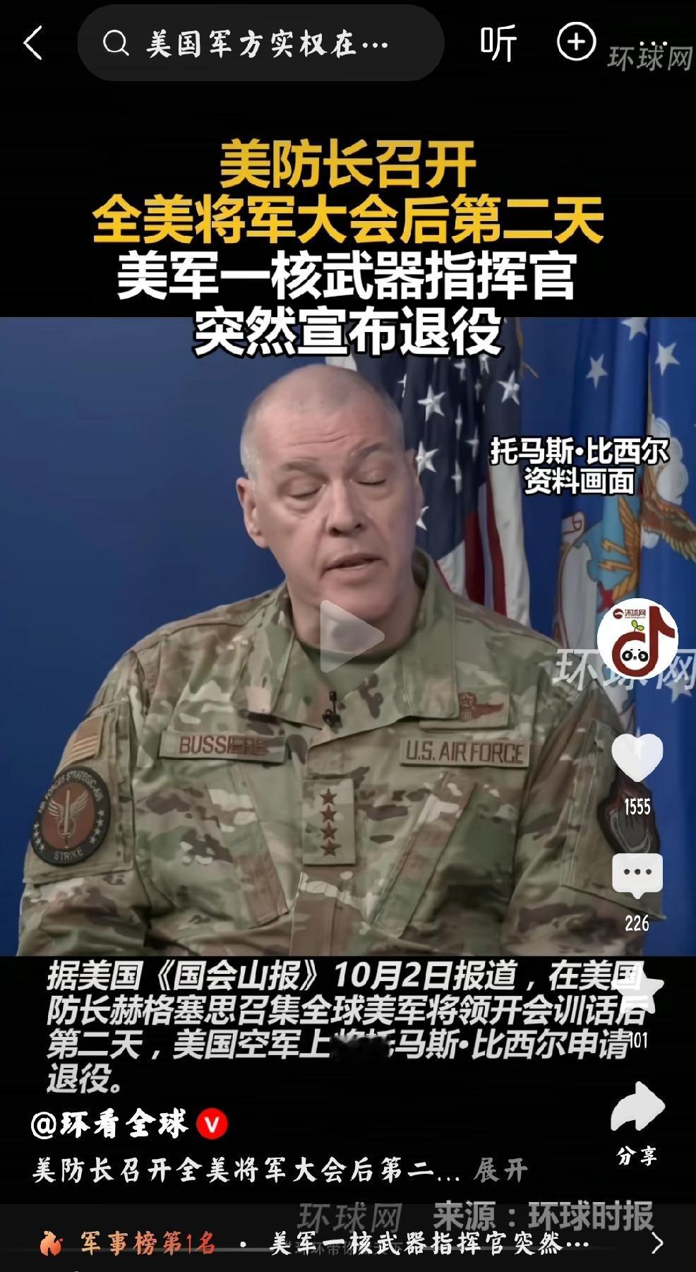 美国:发生了不可控的突变 个人认为,此刻的美国军界以及军界背后深度隐藏的军工复合体,因为特朗普与战争部长的闭门会议,以此契机,以此为时机,作为导火线-表层原因,爆发出了与当下特朗普政府之间的悄无声息的对抗。 而军界与本届政府的矛盾,以及当下各州各市的大规模抗议活动。经济矛盾,政治矛盾,军界矛盾,外交矛盾,种种矛盾都在发挥着互相影响,互相作用,互相促进的形势。 这又将影响特朗普政府的下一阶段举措。 试想,在政府关门大吉之际,军队不能给当下的政府,强有力的支持。而美国各州各市的不断升级的大规模抗议活动,特朗普又将如何管理呢?