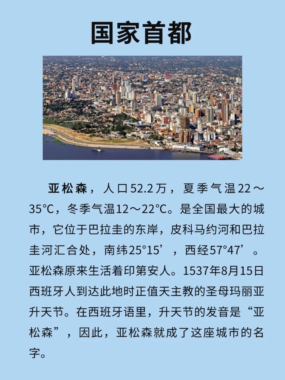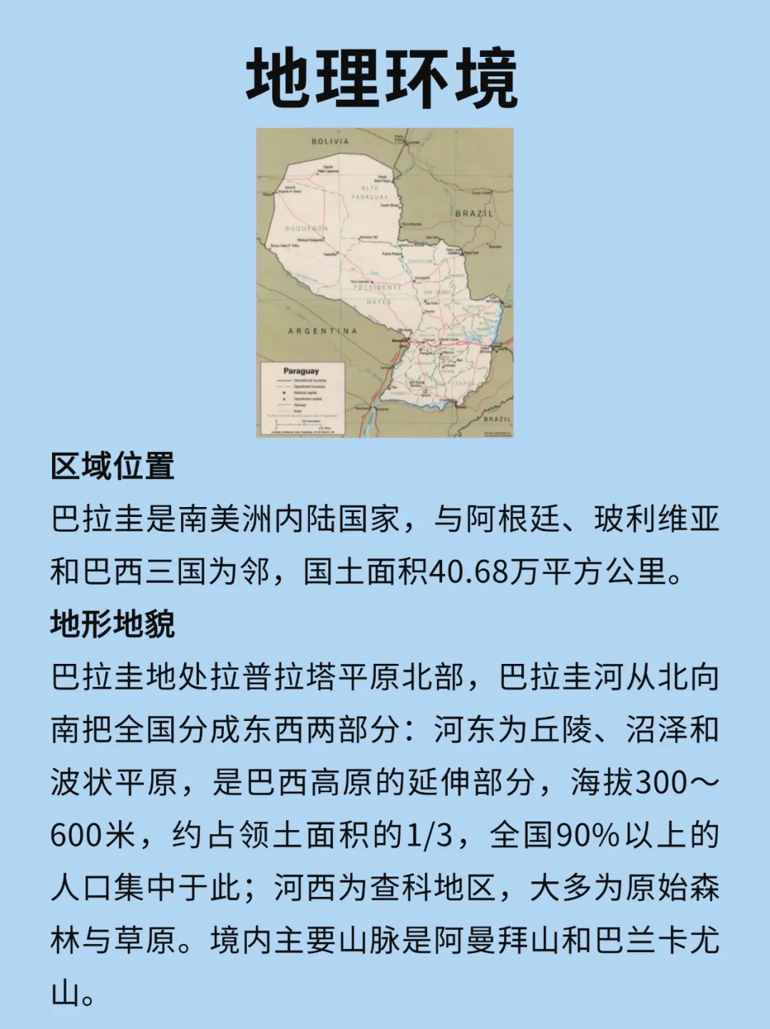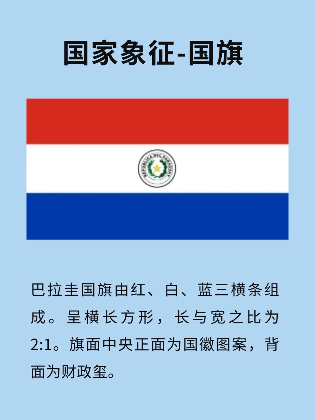 巴拉圭共和国,简称巴拉圭,是南美洲中部的一个内陆国家,境内主要山脉是阿曼拜山和巴兰尤卡山,其南边国境完全与阿根廷接壤,国土面积40.68万平方公里,首都是亚松森。 [打卡R]巴拉圭地处拉普拉塔平原北部,巴拉圭河从北向南把全国分成东西两部分:河东为丘陵、沼泽和波状平原,是巴西高原的延伸部分;河西为查科地区,大多为原始森林与草原。 巴拉圭国旗由红、白、蓝三横条组成。巴拉圭国徽呈圆形。圆面正中是一颗光芒四射的五角星,成为“五月之星”,纪念巴拉圭摆脱西班牙殖民统治,于1811年5月14日获得独立。