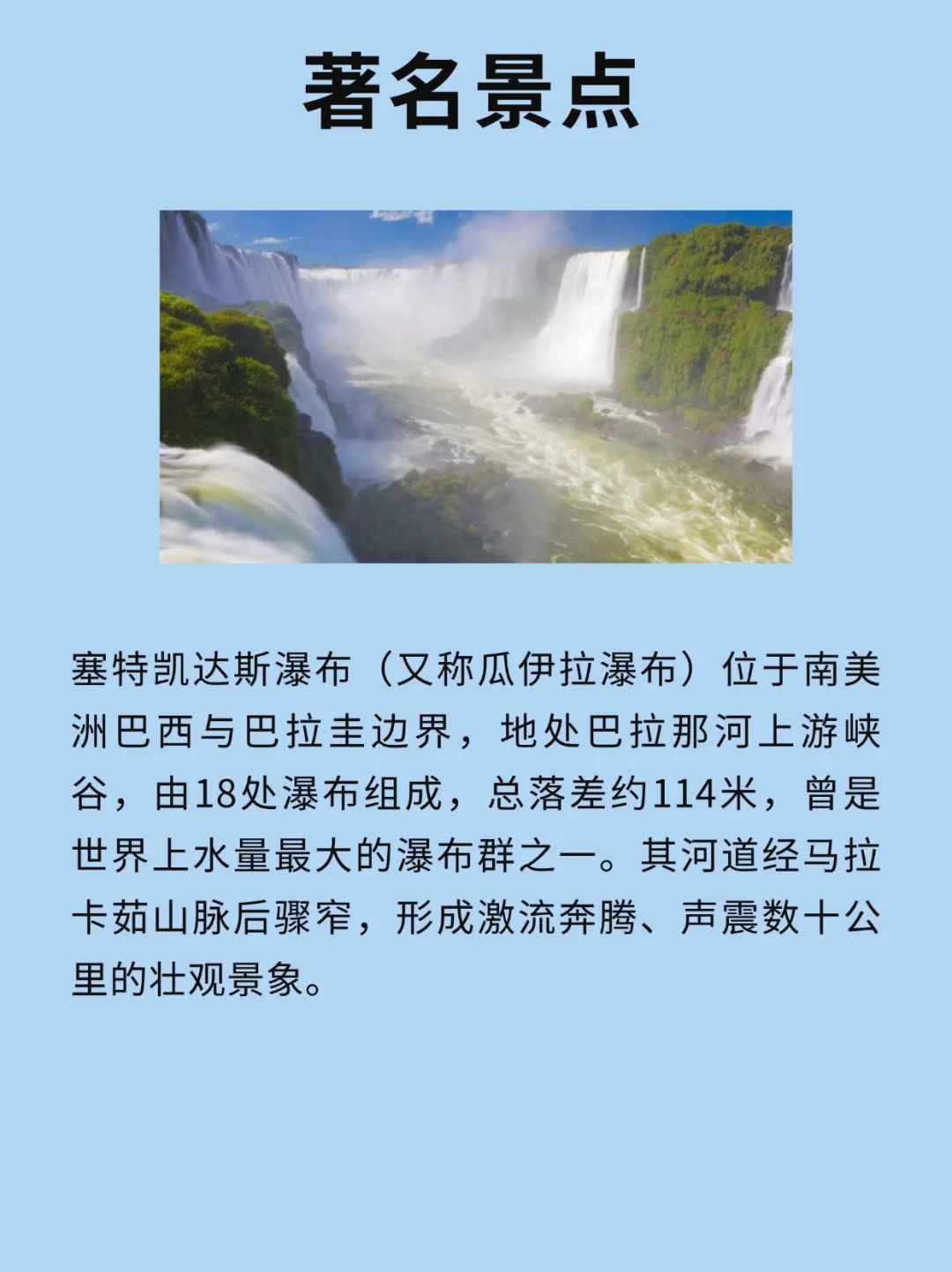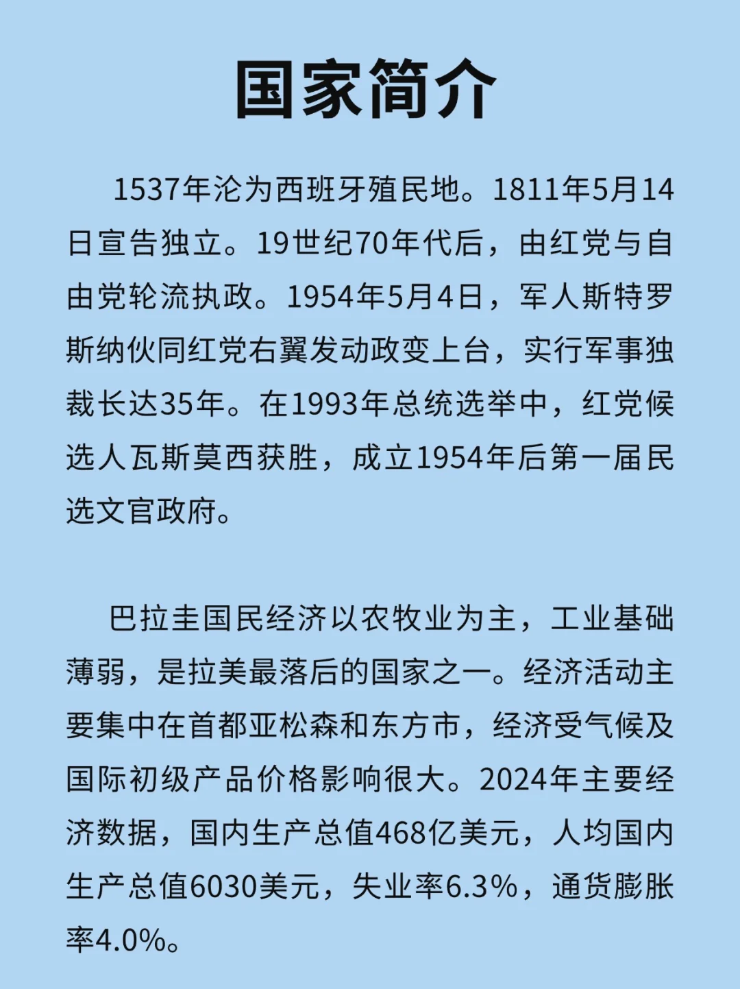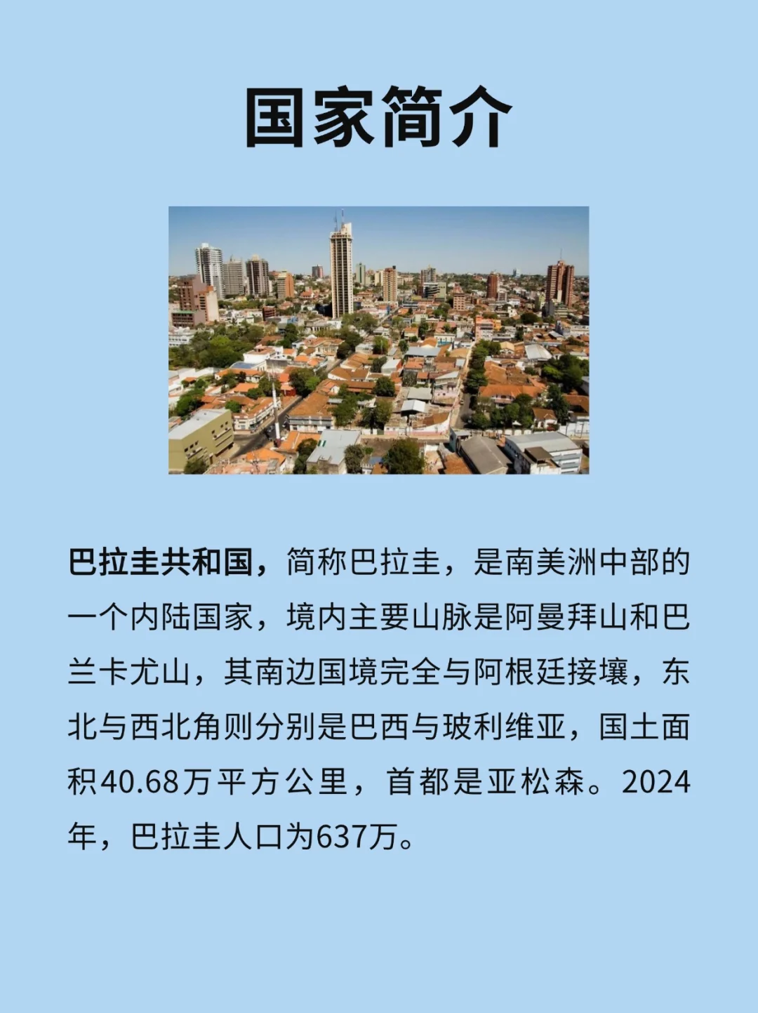 巴拉圭共和国,简称巴拉圭,是南美洲中部的一个内陆国家,境内主要山脉是阿曼拜山和巴兰尤卡山,其南边国境完全与阿根廷接壤,国土面积40.68万平方公里,首都是亚松森。 [打卡R]巴拉圭地处拉普拉塔平原北部,巴拉圭河从北向南把全国分成东西两部分:河东为丘陵、沼泽和波状平原,是巴西高原的延伸部分;河西为查科地区,大多为原始森林与草原。 巴拉圭国旗由红、白、蓝三横条组成。巴拉圭国徽呈圆形。圆面正中是一颗光芒四射的五角星,成为“五月之星”,纪念巴拉圭摆脱西班牙殖民统治,于1811年5月14日获得独立。
