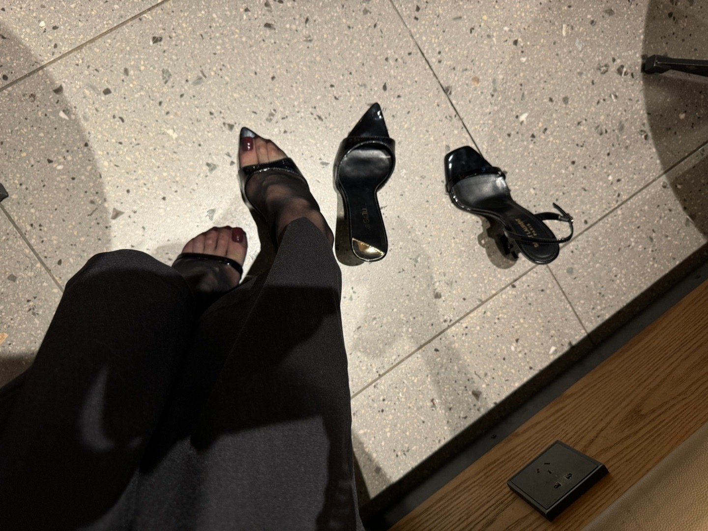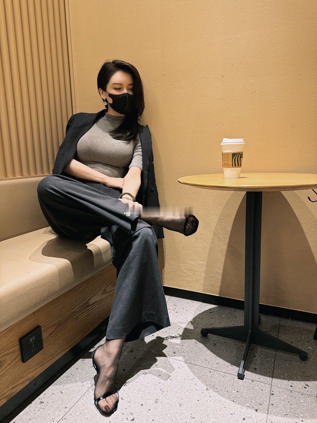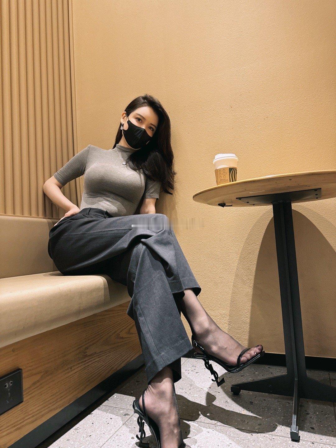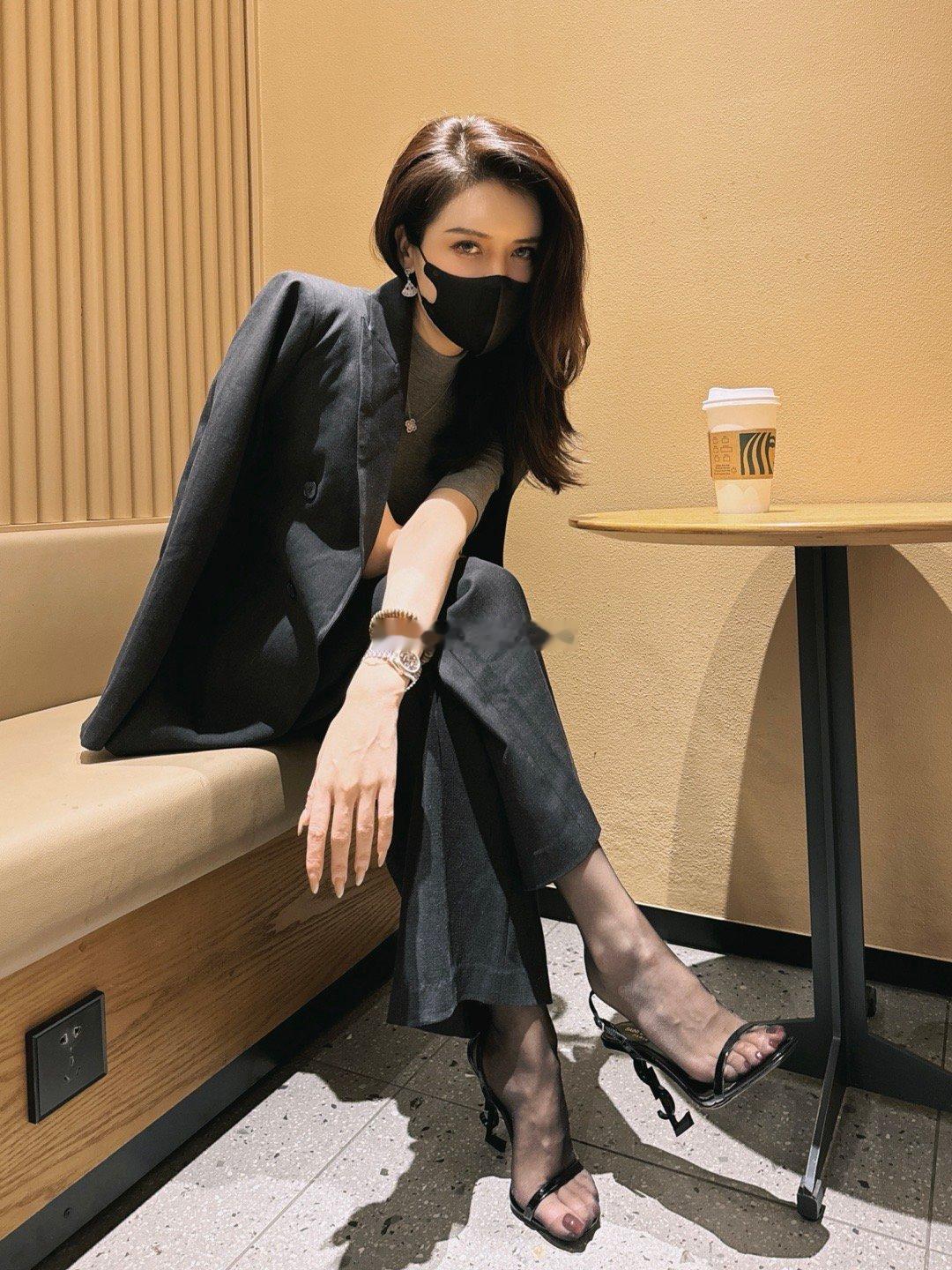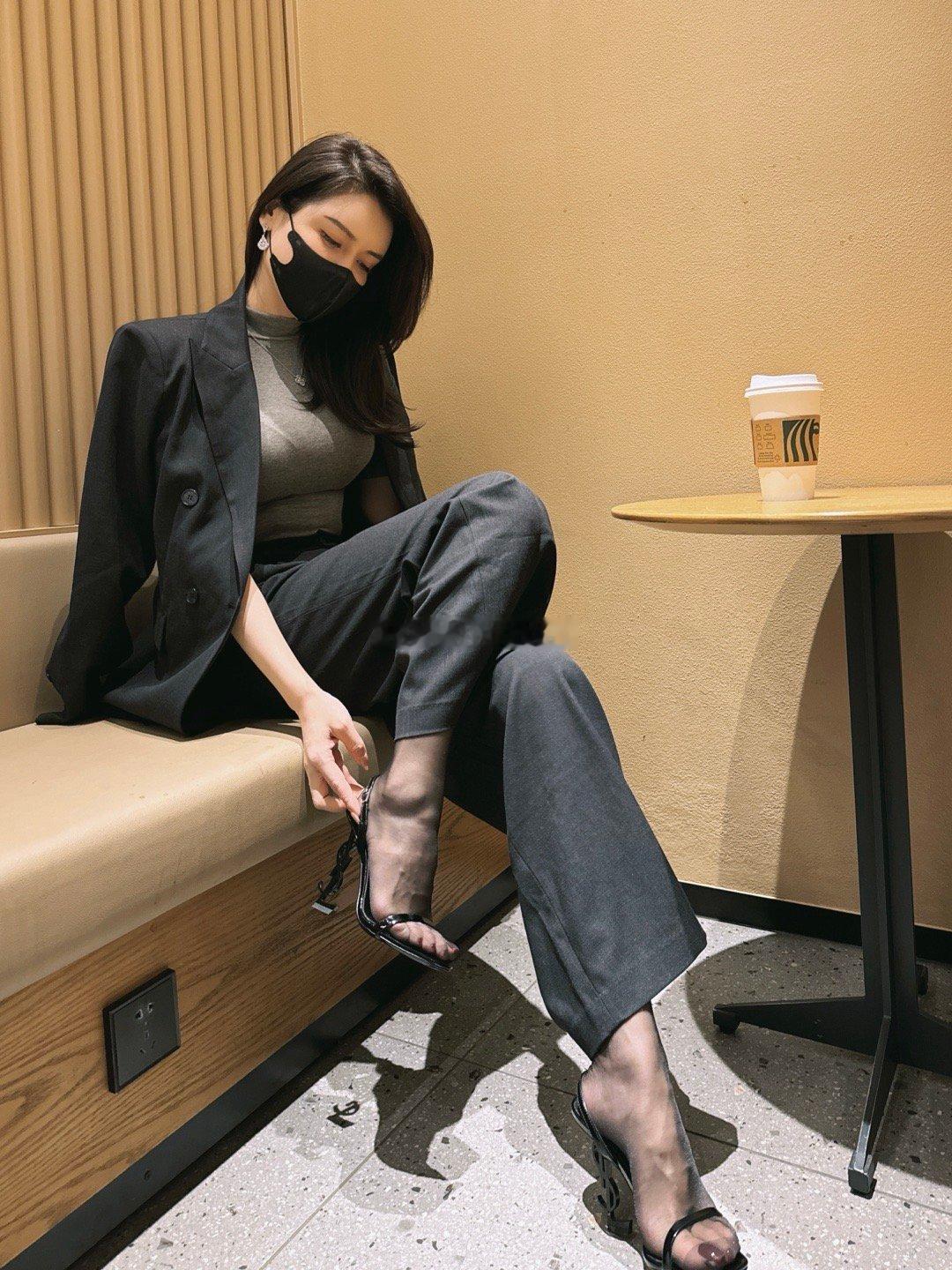 藕粉丝西装➕米色雪纺衬衣➕cl裸色10cm侧空➕咖色挂扣油量吊带袜