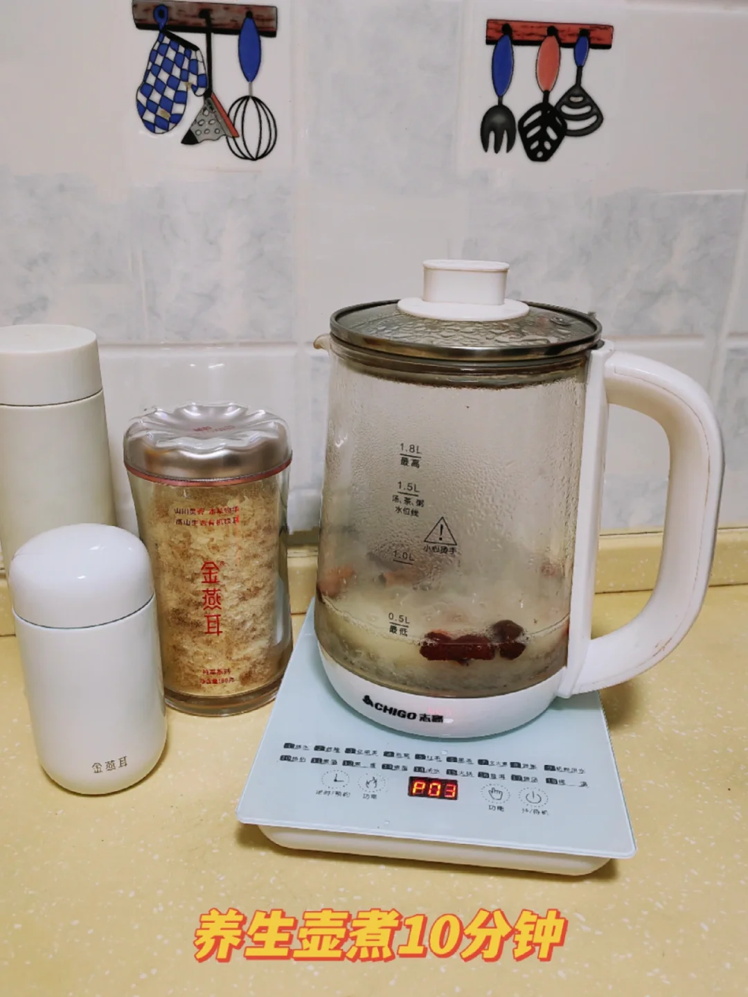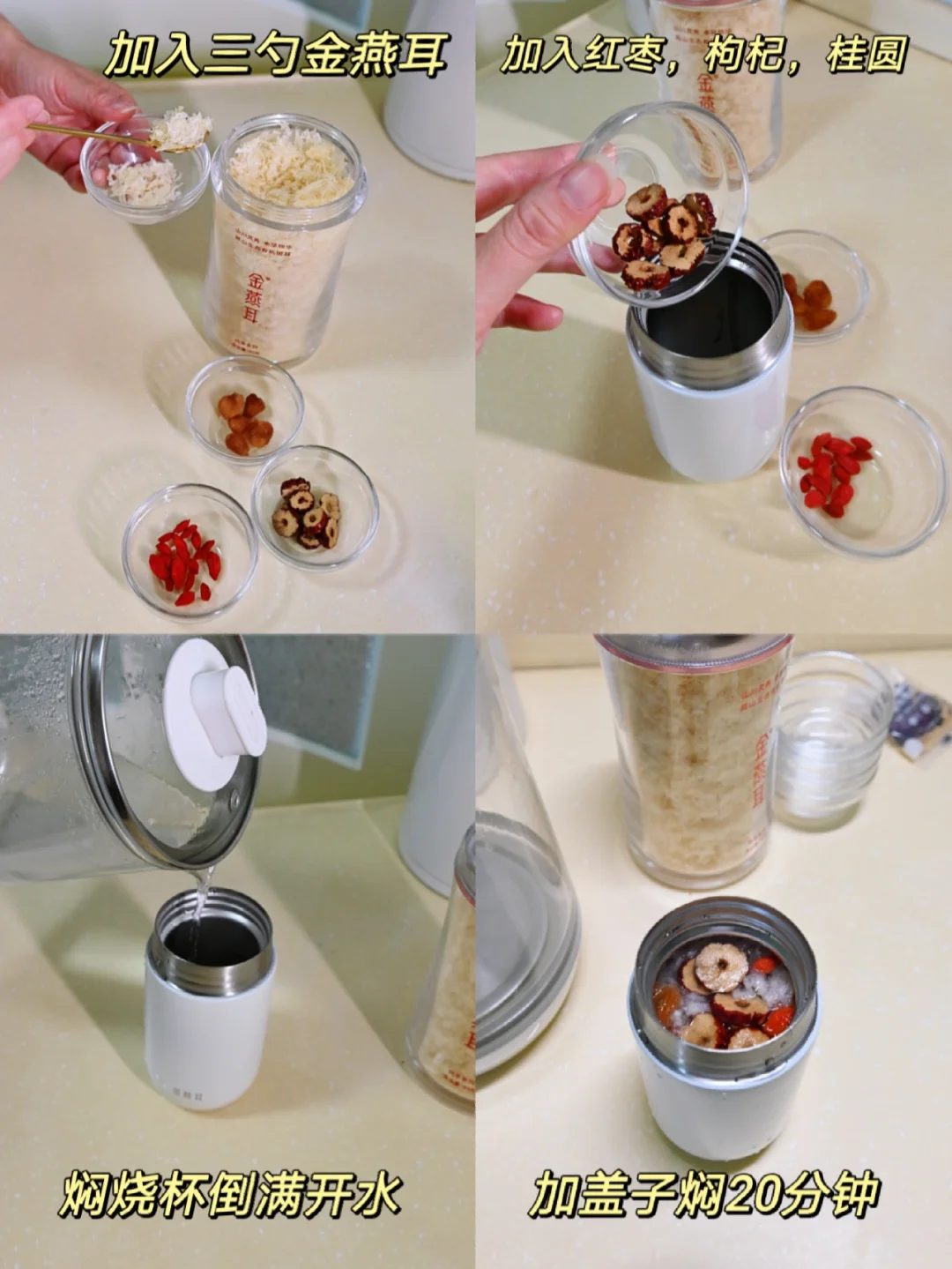 [种草R]准备食材:三勺金燕耳,红枣,枸杞,桂圆肉[向右R]制作方法:把食材都放到焖烧杯中,倒入开水,静候20分钟即可,喜欢软糯口感的可以多等一会,我一般喜欢焖上差不多一个小时。也可以用养生壶煮,10分钟就可以了。