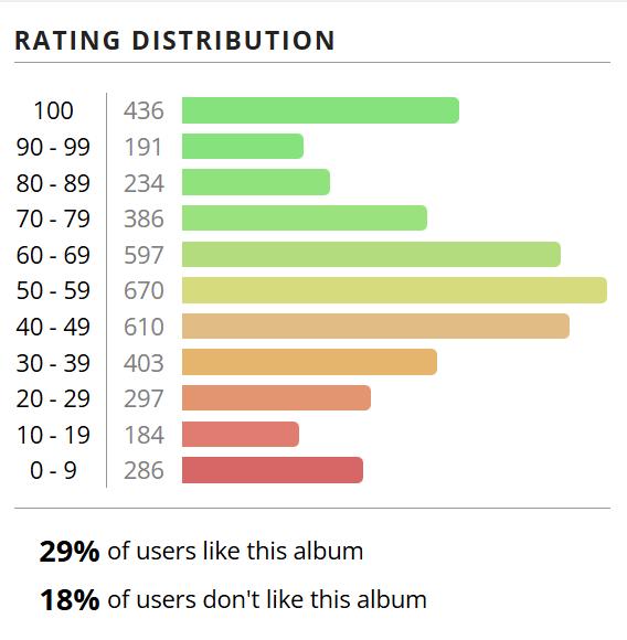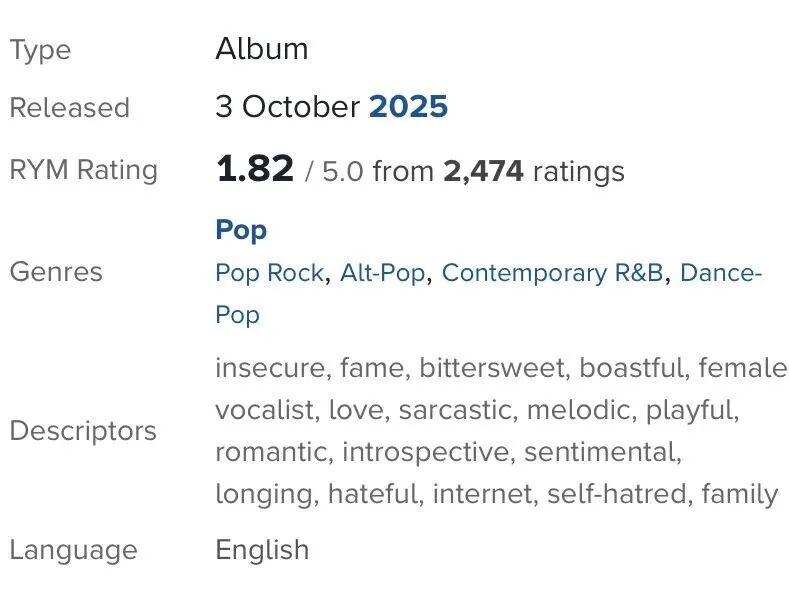 根据最新数据,在全球最大乐评平台 AOTY(Album of The Year)上,霉霉新专辑《The Life Of A Showgirl》遭遇了刷差评的情况。 目前,该专辑的媒体评分为 64 分,此分数基于 9 家乐评机构的评价,在 2025 年度专辑排名中位列第 503 名; 用户评分则为 52 分,该评分综合了 4281 名网友的打分。 此外,在 Rate Your Music 平台上,网友给该专辑打出了 1.82 分(满分 5 分),此评分综合了 2474 名网友的意见。 但我看了这些评分的背后,主要还是被刷差评了。 在参与评分的 4281 名网友中,有相当一部分人恶意给出了 0 分。在我看来,给一张专辑打 0 分,很大程度上就是出于恶意,旨在拉低专辑的总评分。 如果把零分的恶评去掉,专辑总体评分能在70分左右,还是一个非常好的成绩。