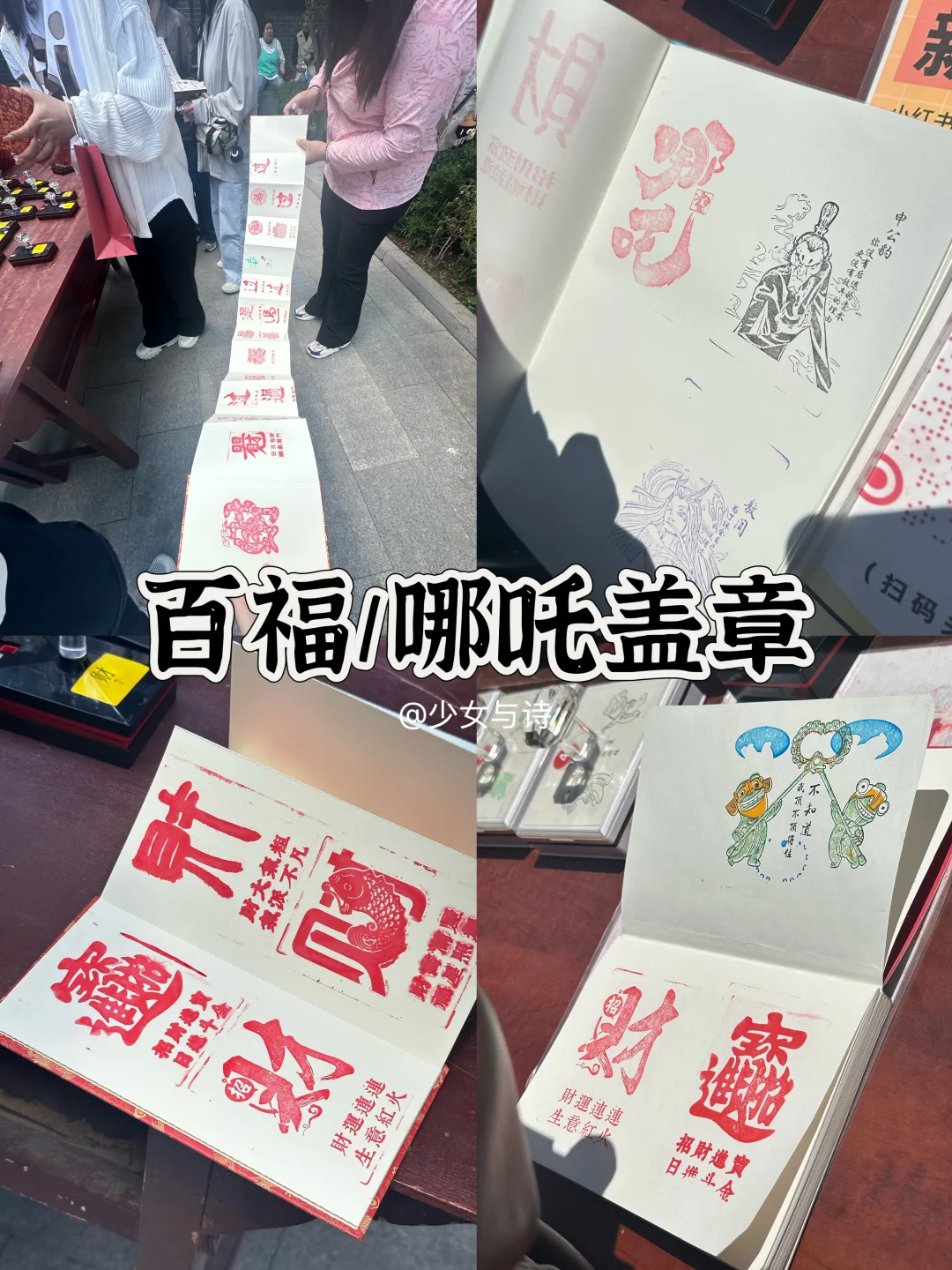 2️⃣百福/哪吒盖章:东塔文创店内可免费盖章,有40种不同的印章,包含哪吒套章(如敖丙、哪吒、太乙真人、殷夫人等形象)、百福章等,还能免费领福纸,按照顺序盖完是彩色的,非常有意思,记得带上小本子去收集独特印记。