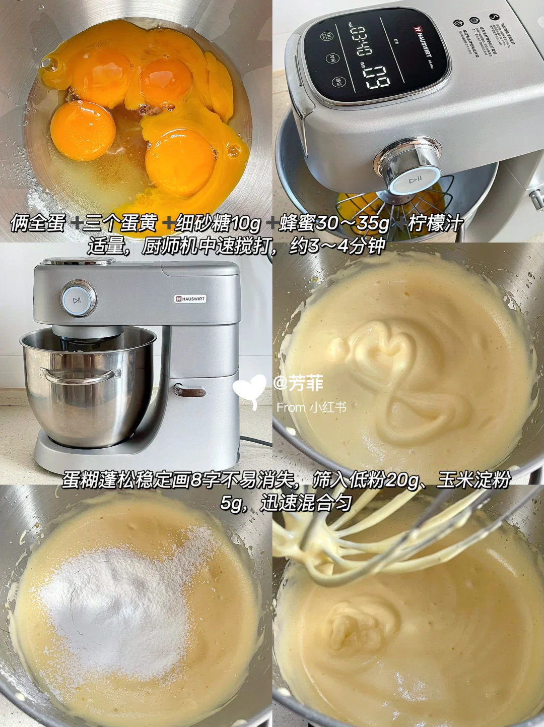 室温鸡蛋2个 蛋黄3个 蜂蜜30g 细砂糖10g 盐1g 柠檬汁适量 低筋面粉20g 玉米淀粉5g