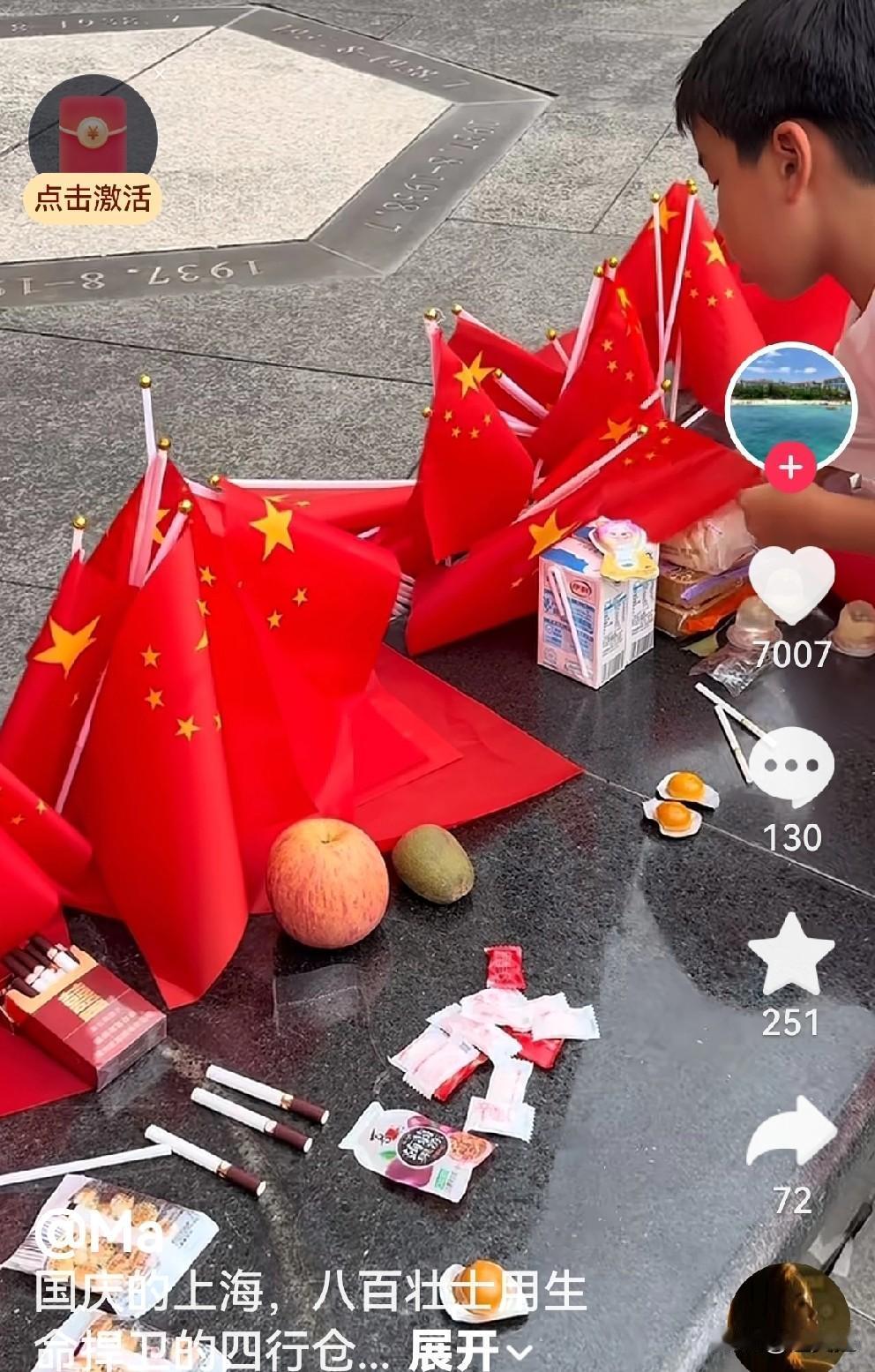 这是上海八百勇士保卫上海四行仓库激战旧址国庆节期间的画面。让人静思,让人感慨,让人泪目,让人欢喜。欢喜是因为从画面来看,是少年儿童献祭,有花朵,有国旗,有食品,有香烟,有……无尽的思念和致敬。让人静思,这个节日里也许最有意义的就是这个了。让人感慨,团聚是家事,欢庆是幸福事,祭拜英烈则是国事。也许会有人说,孩子小,过节快乐,我认为从小教育总比不知道自己来时路卖国求荣要好,不是有一个改掉自己祖宗姓名的小石太郎臭名昭著的前车之鉴吗?淞沪会战四行仓库保卫战很惨烈,从影视剧还原的镜头远不是那时的痛,铭记历史,珍爱和平,国庆节就是这个意思。我记住了,诸君也别忘! 谢谢这些孩子们的父母有担当有责任感。