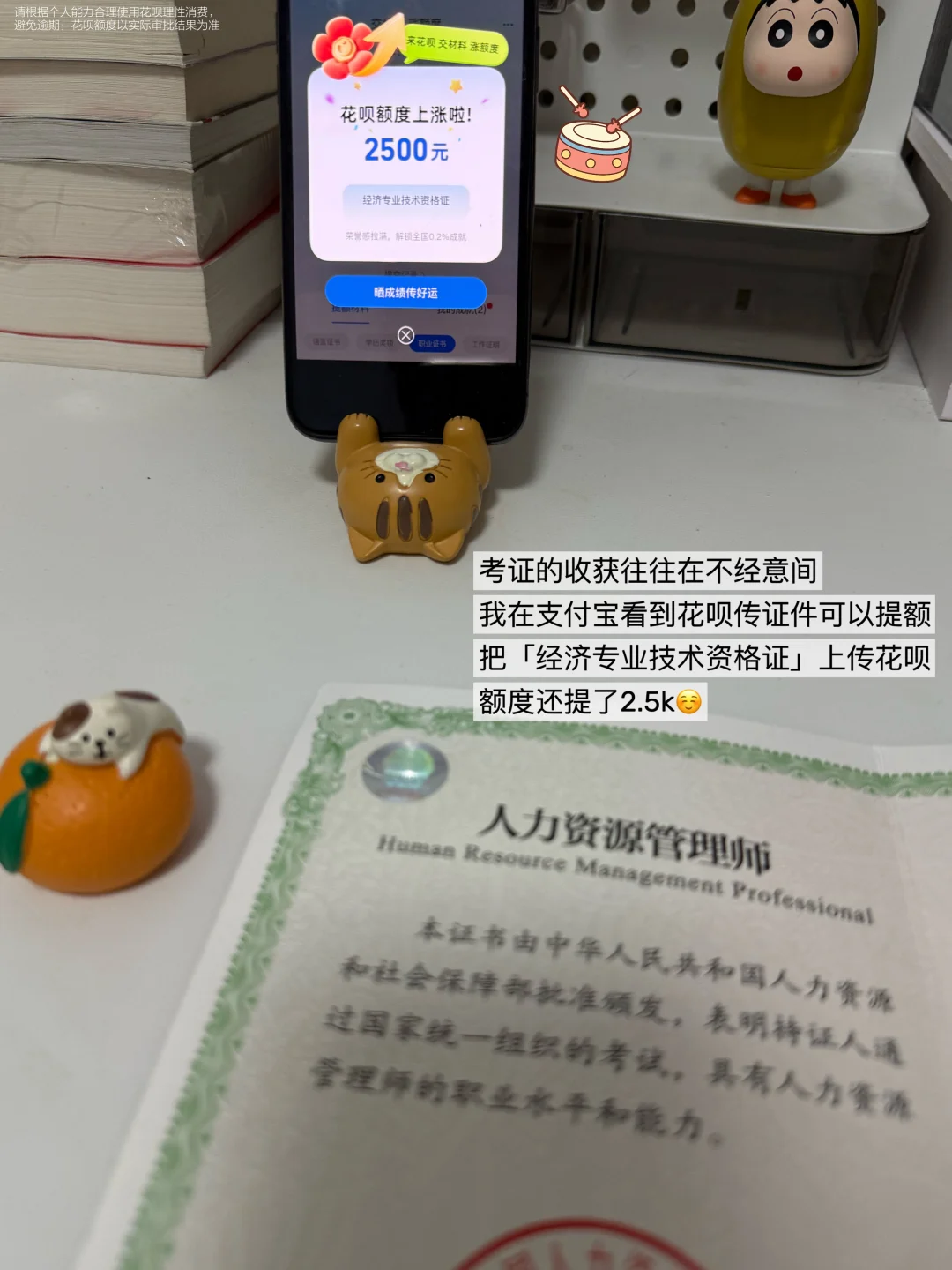 于是,我考了一箩筐的证书,也受益颇多。支付宝搜了花呗提额,我把「经济专业技术资格证」[清单R]上传花呗后,额度还提了2.5k。结合我观察的同事经历,分享几点考证心得,说不定也能点亮你的某个小念头