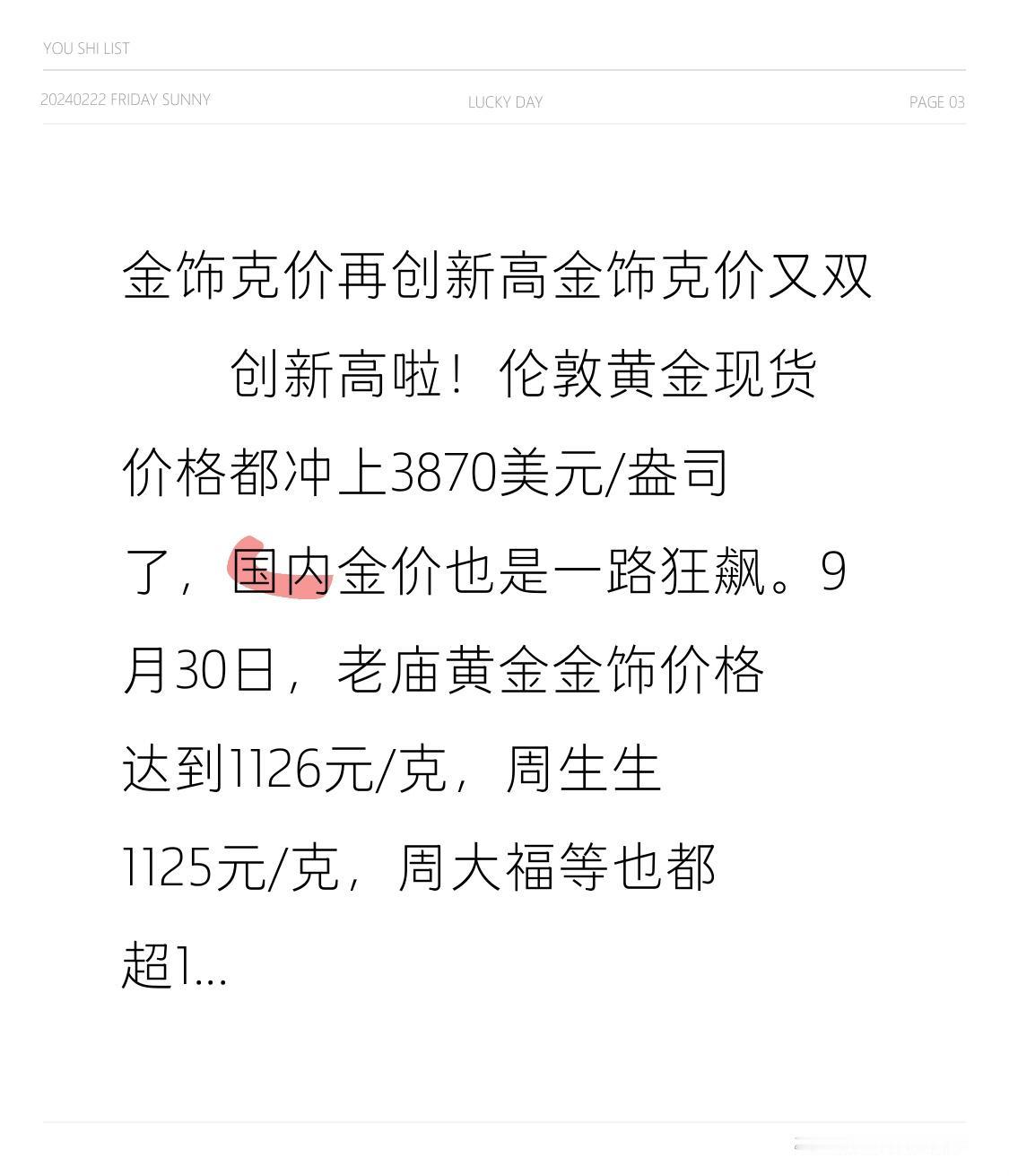 金饰克价再创新高 金饰克价又双叒叕创新高啦!伦敦黄金现货价格都冲上3870美元/