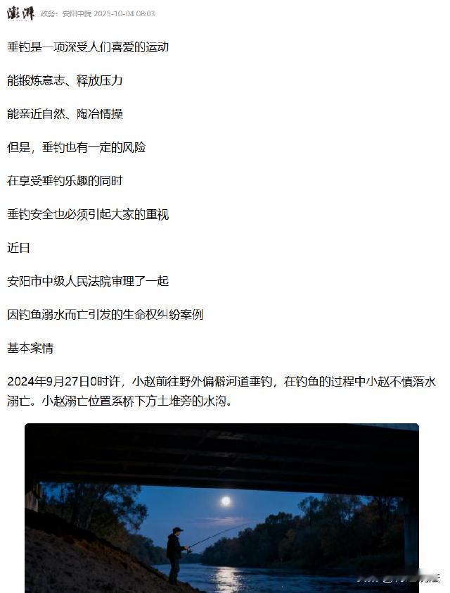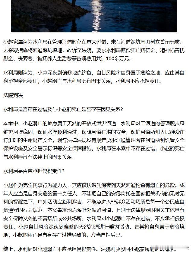 河南安阳,小赵独自去野外偏僻河道钓鱼,不慎落水溺亡在桥下方土堆旁水沟。小赵的家属认为水利局管理河道有过错,向其索赔100余万,水利局称小赵自甘风险,最终诉求被驳回。 素材来源于:安阳中院 2025-10-04 08:03 老赵最近总是对着儿子的照片发呆,照片里小赵的笑容灿烂,可如今却天人永隔。 这一切,都源于2024年9月27日那个夜晚。当天,小赵和几个朋友聚会,饭桌上大家聊起钓鱼的趣事。聚会结束后,已经凌晨了,小赵却瞒着家人,带着渔具独自去偏僻的一处河道钓鱼。 河道周围到处都是杂草,平时就很少有人去,小赵找了个自认为合适的位置,支起鱼竿,开始钓鱼。 小赵为了调整鱼竿的位置,身体不自觉地往前倾。突然,脚下一滑,整个人失去平衡后一头栽进了河里。 小赵不会游泳,在水中胡乱扑腾了几下后,便渐渐没了力气,缓缓沉了下去。 第二天清晨,一位早起路过的村民,才发现了溺亡在桥下方土堆旁水沟里的小赵。村民赶紧报了警,等民警和急救的人员赶到现场时,小赵早已没了气息。 在悲痛中,老赵夫妻俩发现,河道周围却没有明显的警示标志,水利局也没有对深坑进行填埋。老赵觉得,就是因为水利局管理不善,儿子出了事。 于是,老赵夫妻俩一纸诉状将水利局告上了法庭,老赵夫妻二人的诉求是:水利局作为河道的管理部门,有责任保障河道的安全,设置警示标志和填埋深坑是他们的义务,要求水利局承担责任。要求水利局赔偿死亡赔偿金、精神损害抚慰金等各项费用共计100余万。 面对老赵一家的指控,水利局认为:小赵作为一个成年人,应该知道深夜去天然河道钓鱼的危险性,是他自己冒险前往,才导致了悲剧的发生,与水利局没有关系,小赵是自甘 风 险。 那么,小赵的行为在法律上该如何定性,水利局又是否需要承担法律责任呢? 1,小赵的行为,该如何被认定呢? 《民法典》第一千一百七十六条规定,自愿参加具有一定风险的文体活动,因其他参加者的行为受到损害的,受害人不得请求其他参加者承担侵权责任;但是,其他参加者对损害的发生有故意或者重大过失的除外。 虽然此条主要针对文体活动,但自甘风险原则有普遍适用性。 小赵作为完全民事行为能力人,深夜独自前往野外偏僻河道钓鱼,对于这种天然河道本身存在的危险,如河道深浅不一、土坡湿滑等情况,应当有清晰的认知。 他选择在深夜前往,且独自行动,没有采取任何安全保障措施,将自己置于危险境地,属于典型的自甘风险行为。 也就是说,小赵应当预见深夜到天然河道钓鱼可能存在的危险,却依然为之,从法律上讲,他要为自己的行为后果负责。 根据《民法典》第一千一百六十五条,行为人因过错侵害他人民事权益造成损害的,应当承担侵权责任。 此条款明确了过错责任原则,即行为人实施侵害他人的民事权益时具有主观上的故意、过失等过错心理,该类侵权行为应当承担侵权责任。 从主观过错来看,小赵应当预见深夜到天然河道钓鱼可能存在的危险,却依然为之,存在过失。 虽然他的行为并未直接侵害他人民事权益,但这种自甘风险的行为导致了自身溺亡的结果,从法律责任承担的角度,他自身对损害结果的发生存在过错。 那么,水利局到底有没有责任呢? 水利局作为河道管理部门,对河道负有管理职责。但管理职责并非意味着要保证河道绝对安全,不存在任何危险。 对于天然河道,其本身就存在诸多不可预见的自然因素导致的危险。虽然河道有深坑,周围没有明显警示标志,水利局也未填埋深坑,但天然河道并不属于公共场所。 根据《民法典》第一千一百九十八条规定,宾馆、商场、银行、车站、机场、体育场馆、娱乐场所等经营场所、公共场所的经营者、管理者或者群众性活动的组织者,未尽到安全保障义务,造成他人损害的,应当承担侵权责任。 水利局的主要职责是保障河道行洪安全、水资源合理利用等,并非要对河道内所有可能存在的危险进行消除和警示。 所以,不能简单地认为水利局未设置警示标志和填埋深坑,就必然要承担赔偿责任。 《民法典》第一千一百六十五条还规定了过错推定责任原则,即依照法律规定推定行为人有过错,其不能证明自己没有过错的,应当承担侵权责任。 过错推定责任原则调整的范围不是一般侵权行为,而是一部分特殊侵权行为,在证明主观过错要件上实行举证责任倒置,原告不承担举证责任,而是由被告承担举证责任。 在本案中,并不适用过错推定责任原则。因为水利局的管理行为并不属于法律规定的适用过错推定责任的特殊侵权行为范畴。 水利局无需承担证明自己没有过错的举证责任,家属一方需要证明水利局存在过错以及该过错与小赵溺亡结果之间存在因果关系。 但从案件事实来看,家属难以提供充分证据证明水利局存在法定应当承担责任的过错情形。 最终,审理认为,小赵作为完全民事行为能力人,应当预见深夜到天然河道钓鱼可能存在的危险,是他自己将自己置于危险境地,驳回老赵一家的诉求。