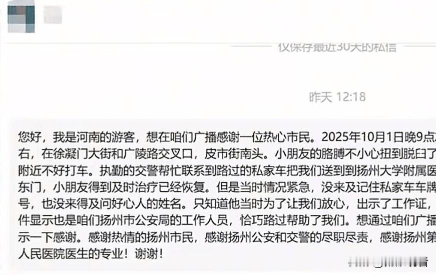 河南游客的感谢信:扬州是一座有温度的城市 10月1日晚9点,河南的一家四口在扬州皮市街游玩时,孩子不慎胳膊脱臼,焦急万分。就在这时,他们遇到了三位好心人,让这个国庆假期充满了温暖。 👮♂️ 热心相助的三位 ①刘子语、王凯:徐凝门警务站的铁骑队员。他们第一时间赶到,在繁忙的路口疏导交通,为孩子开辟出一条生命通道。 ②蔡晶晶:扬州市公安局江都分局交警。她和先生正好路过,了解情况后,毫不犹豫地说:“不管顺不顺路都要送!” 我觉得这三位的迅速反应和无私帮助,让孩子得到了及时救治,也让游客一家感受到了扬州的温暖。 ❤️ 温暖在接力 孩子在医院得到妥善治疗后,一家人特意写来感谢信。信中说,扬州的美,不仅在于风景,更在于这些在关键时刻挺身而出的普通人。 这三位好心人让他们看到了“扬州温度”,也让“扬州好人”的形象更加闪亮。 👍 为他们点赞! 让我们一起为刘子语、王凯、蔡晶晶点赞!是你们的专业和担当,让这座城市更有安全感,也更有温度。