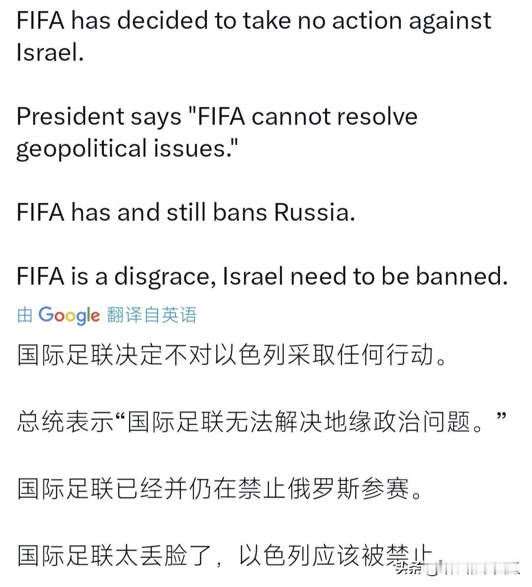 国际足联最终决定 不对以色列采取任何行动 理由是FIFA无法解决地缘政治问题 这