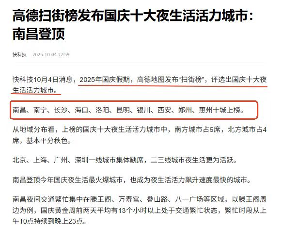 看到高德扫街榜发布的2025国庆十大夜生活活力城市,南昌排在了第一位,然后是南宁、长沙、海口、洛阳、昆明等城市。