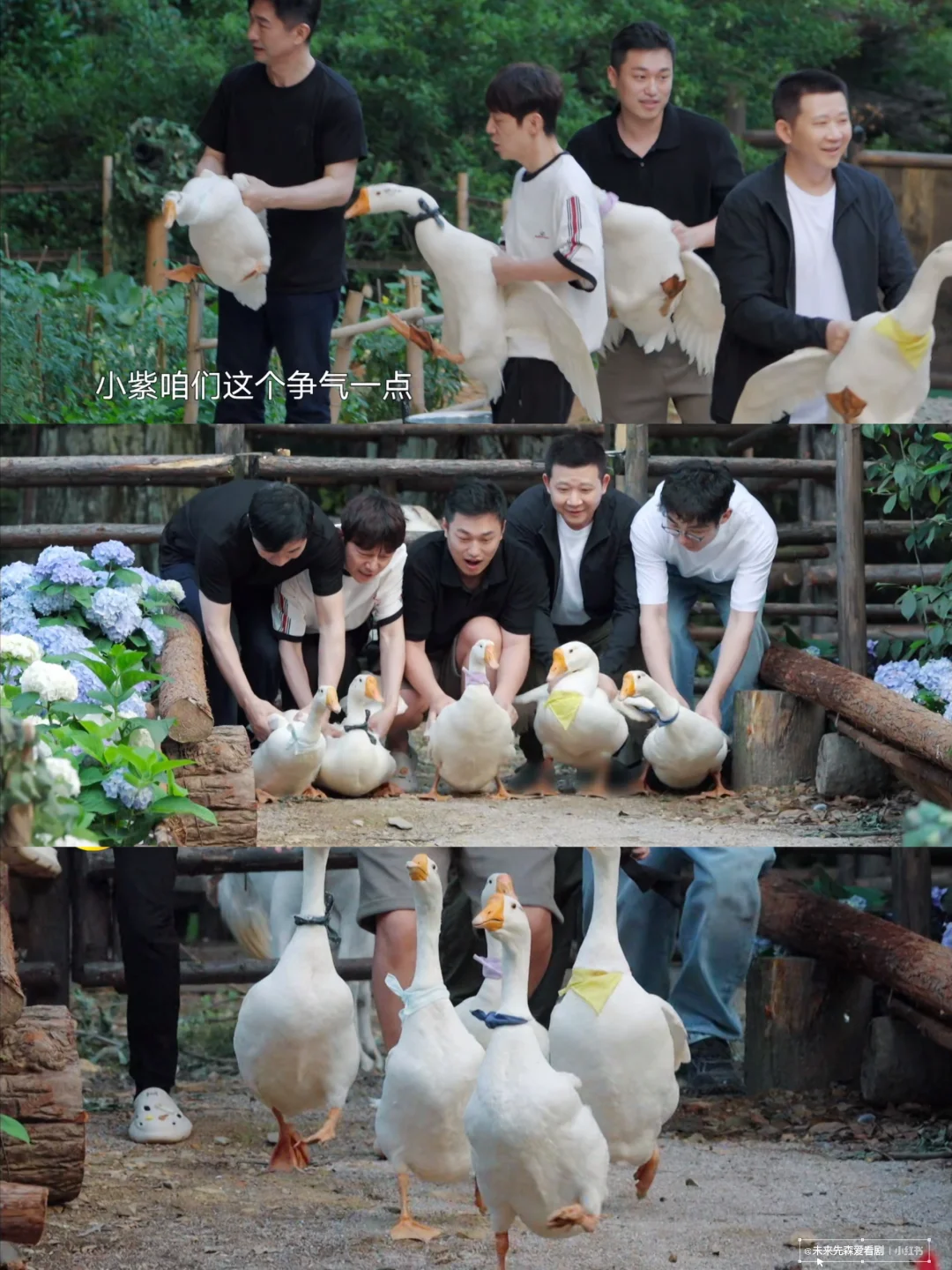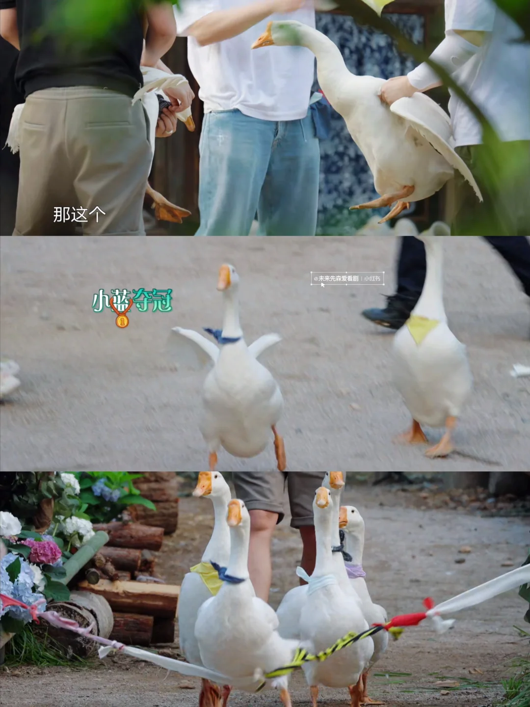 导演组给他们弄了一车鸡鸭鹅那里,新老成员精挑细选自己称心如意的大鹅,标记各色丝带,自己搭建赛道,设置终点线,一声令下,大鹅在前面跑,新成员在后面边追边加油,短短的土路硬是跑出了短跑赛道的即视感,最终小蓝率先撞线,有人欢呼,有人遗憾,真的笑出眼泪😂