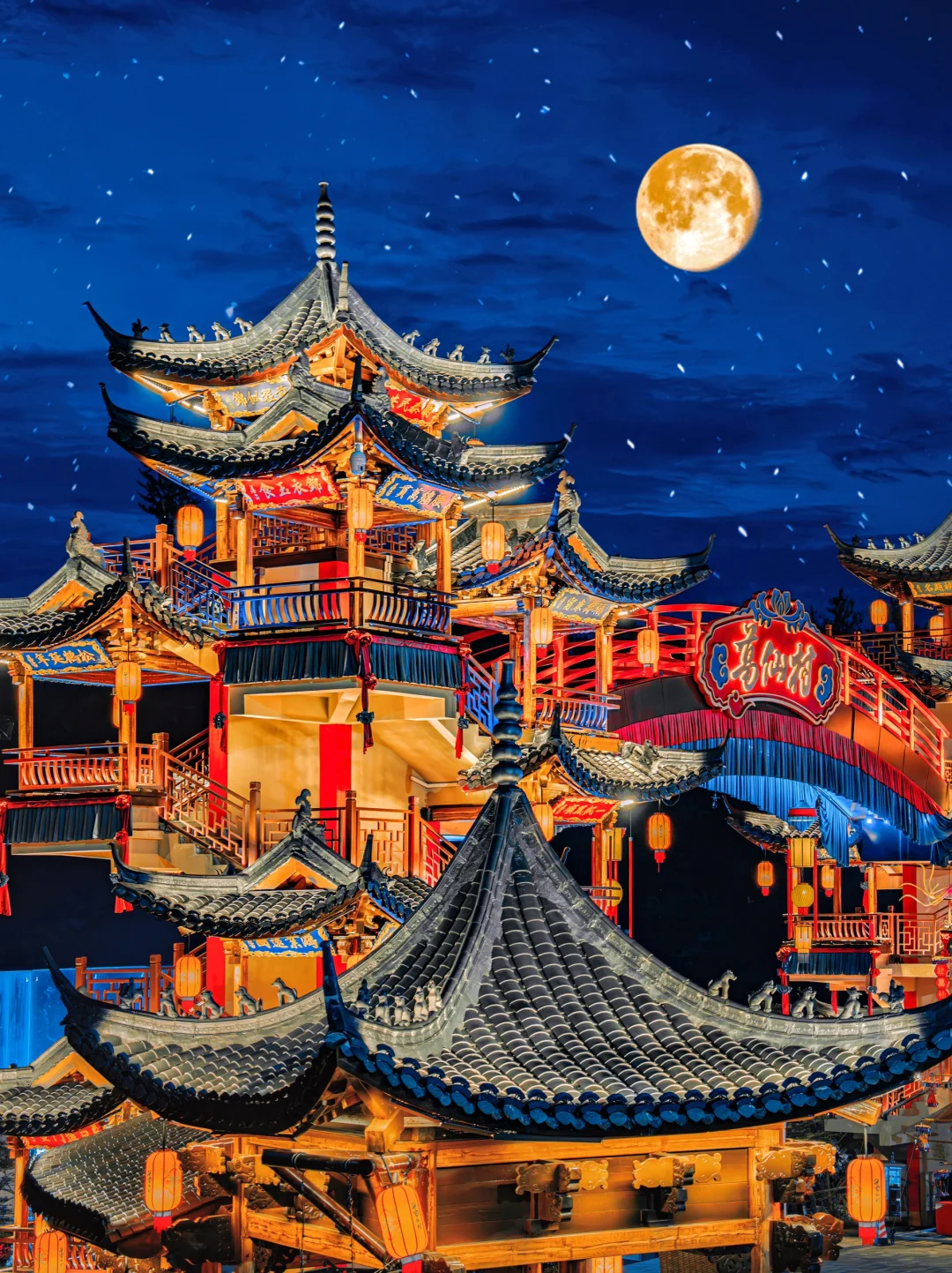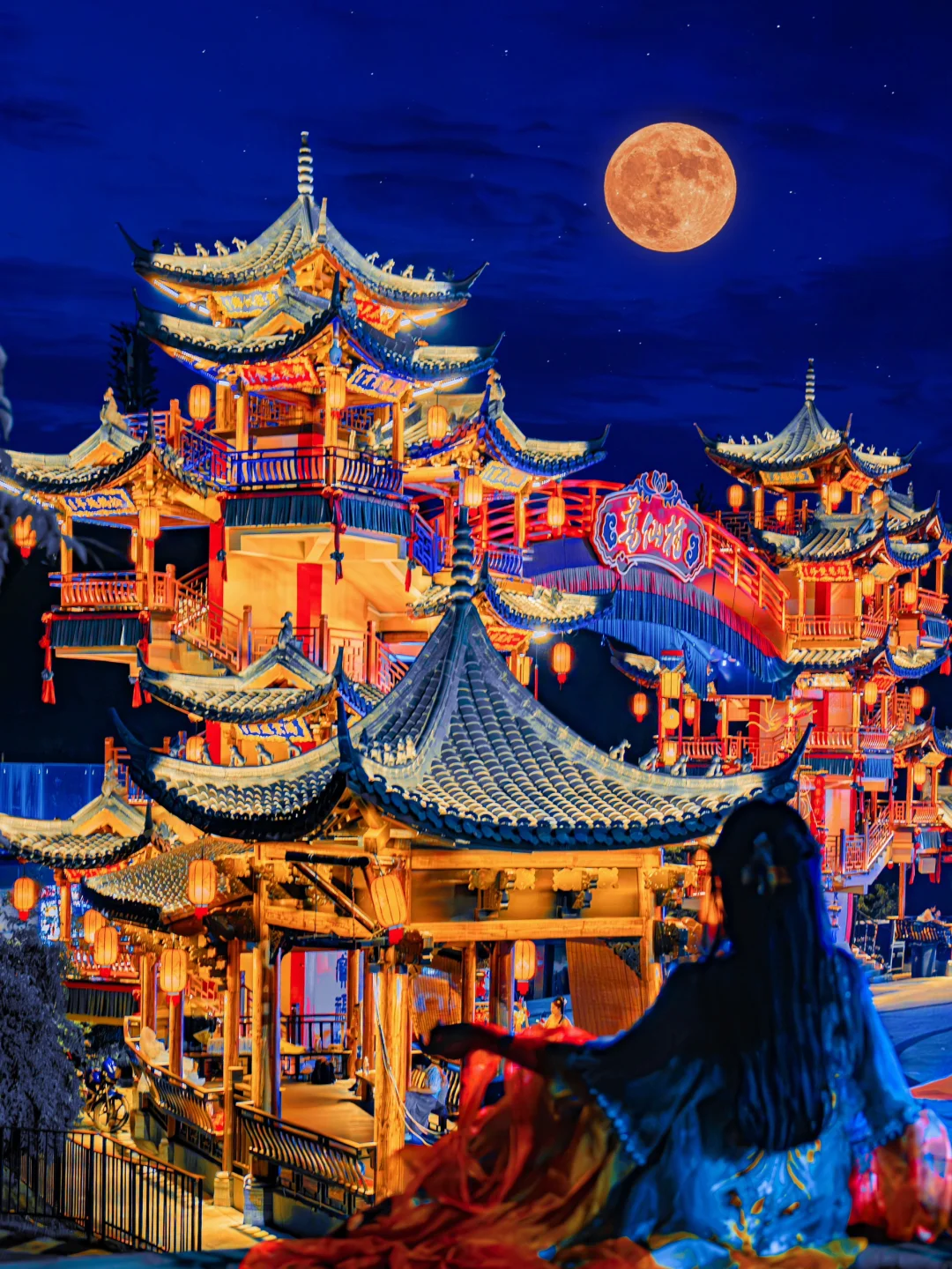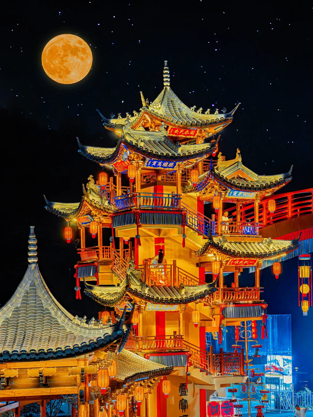 夜幕降临,在摘星楼檐下鎏金牌匾前,拍李白笔下的“手可摘星辰”大片!