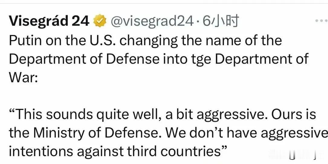 普京就美国防部更名为战争部表态:“这听起来不错,有点咄咄逼人。我们是国防部。我们没有针对第三国的侵略意图。” 普京就是普京,真的很睿智!既没有明确批评指责美国,又指明美国更名战争部的侵略意图!硬汉风采,软中带硬!