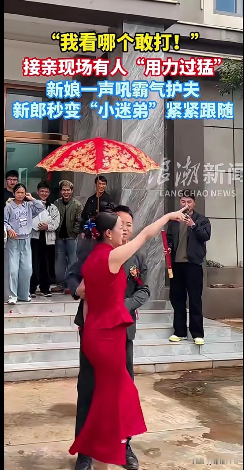 “家人们快看这个霸气新娘!接亲现场有人想‘用力过猛’整蛊新郎,新娘直接一声吼:‘我看哪个敢打!’ 这护夫架势绝了,新郎秒变小迷弟紧紧跟着。这样的神仙爱情谁不羡慕啊!新娘这波操作太圈粉了,嫁人就该找个能被自己霸气保护,也把自己宠成公主的人~婚礼 霸气新娘