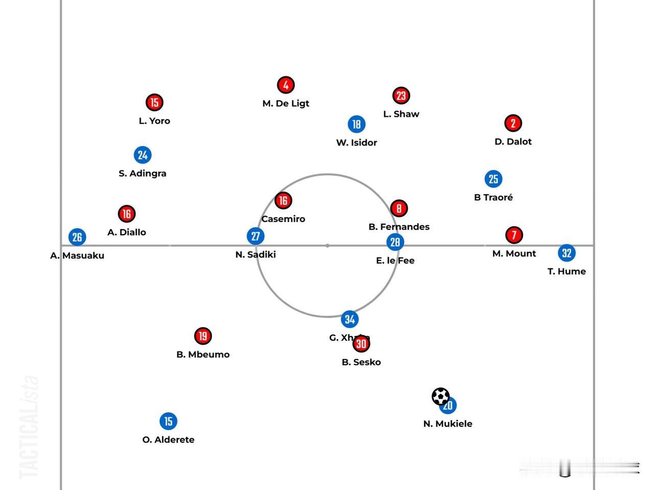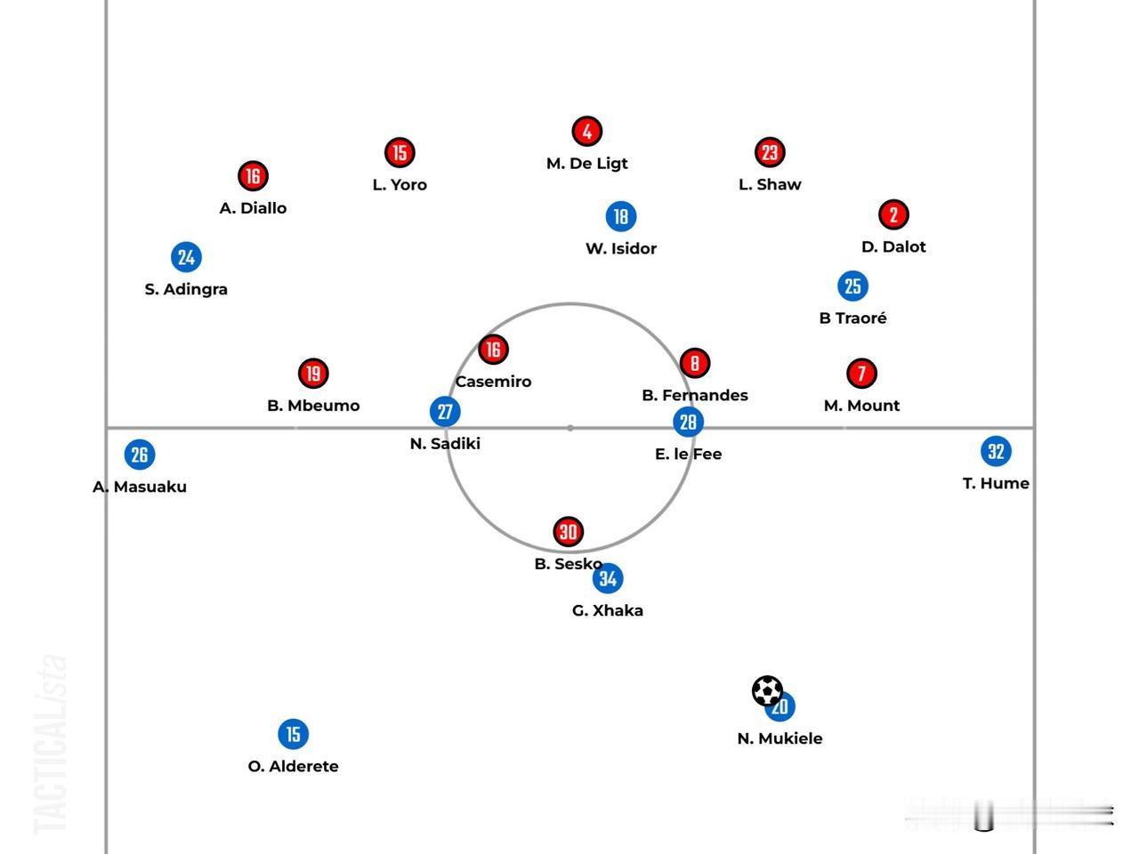 曼联阵型保持紧凑,采用中度防守站位,在5-4-1、5-3-2与4-4-2阵型间灵活切换。 这套战术思路本身并无问题,能有效减少球队防守空档,但球员(尤其是锋线球员)似乎仍未完全熟练掌握战术要求——因其需承担复杂职责,包括封堵中路传球路线、及时上抢盯防对手,以及阻止桑德兰形成3打2的人数优势。 另一点值得注意的是,当姆贝莫从二线前插,球队阵型看似转为5-3-2时,中场三人组却偏向左侧站位,导致右侧出现人数劣势。 通常情况下,此时需迪亚洛前插补位,以化解桑德兰在该区域的人数优势。