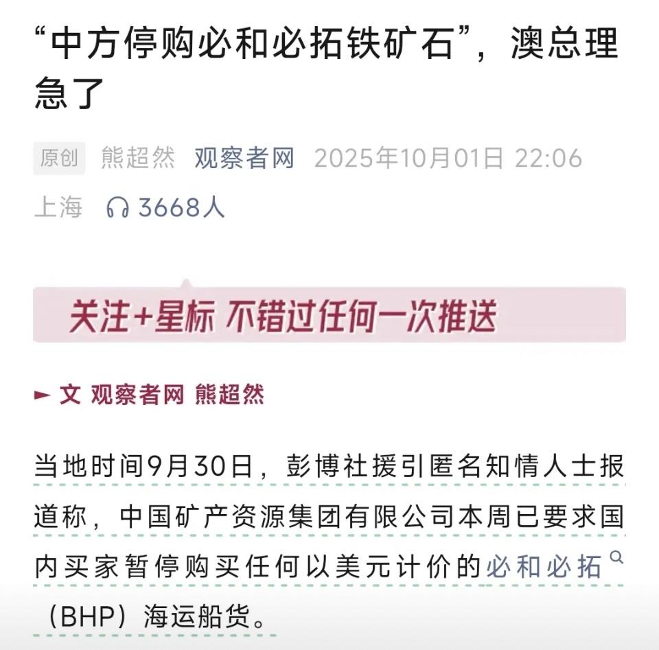 最近有个挺重要的事儿可能好多人没注意到!中国让钢铁企业暂停从澳洲买铁矿石啦。为啥呢? 因为好多给咱供应铁矿石的,像非洲国家、巴西淡水河谷都同意用人民币结算了,就澳洲一直不松口。咱中国可不含糊,直接不买他们的,表明态度! 放在以前,谁敢想会这样啊?以前咱确实挺依赖澳洲铁矿石,可现在不一样啦。咱通过“一带一路”,在南美建港口、规划铁路,还在几内亚帮忙搞建设,铁矿石来源多了去了。而且咱还研究出了新方法,让巴西铁矿石利用率大增。这下好了,不管是议价还是货币结算,咱都有话语权,再也不用看澳洲脸色啦。 你觉得澳洲最后会妥协用人民币结算不?快来评论区聊聊你的看法呗!