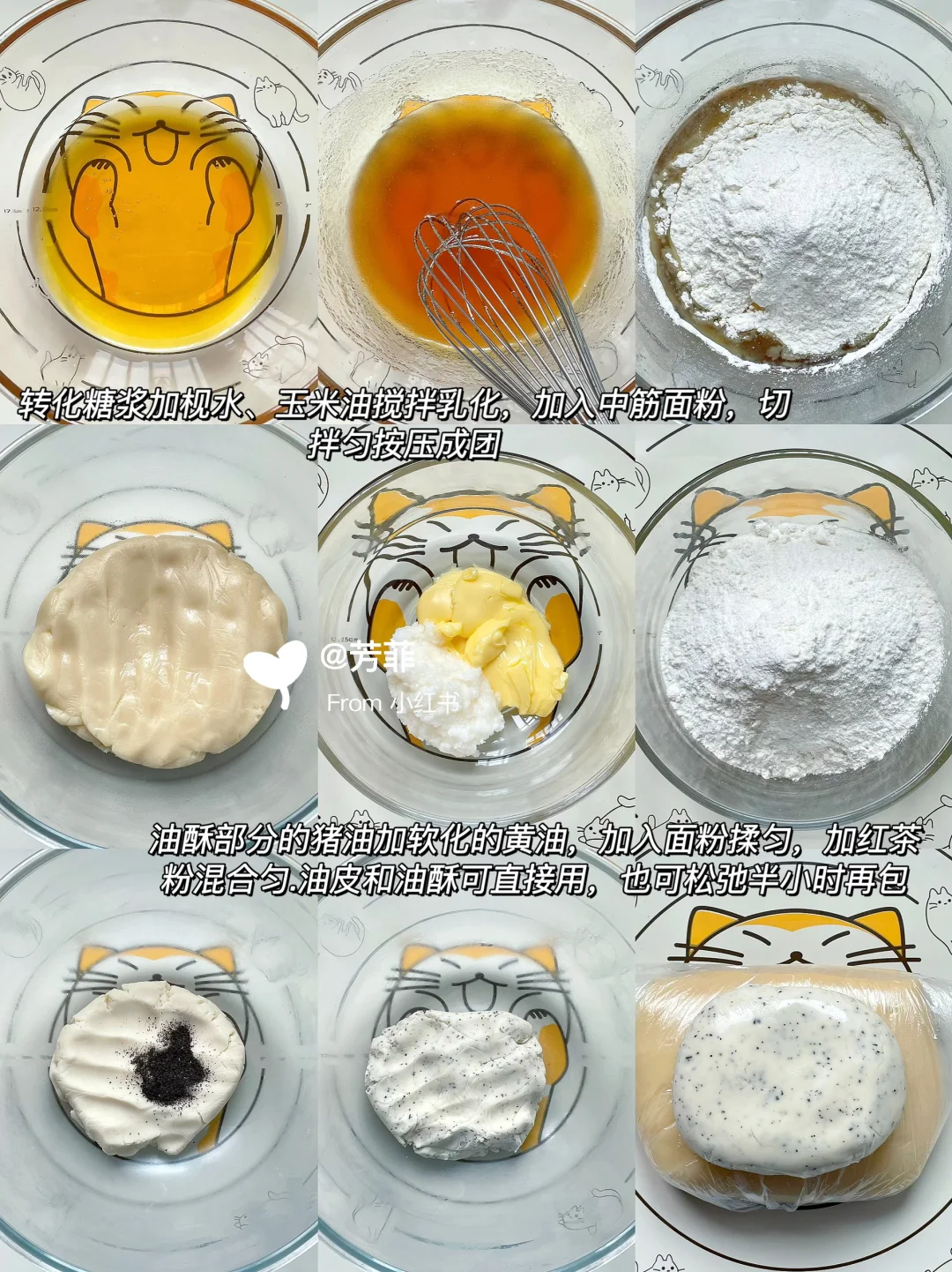 2️⃣再来做酥皮,碗中加入转化糖浆、枧水、玉米油搅打乳化,加入中筋粉切拌匀按压成团裹保鲜膜松弛备用.接着做油酥,软化的黄油加猪油加中筋粉混合抓捏揉匀.一起松弛半小时再用,也可以直接用,看个人习惯⚠️油皮的状态是柔软不粘手延展性好,压扁后塑型好不变形.避免太干或太湿
