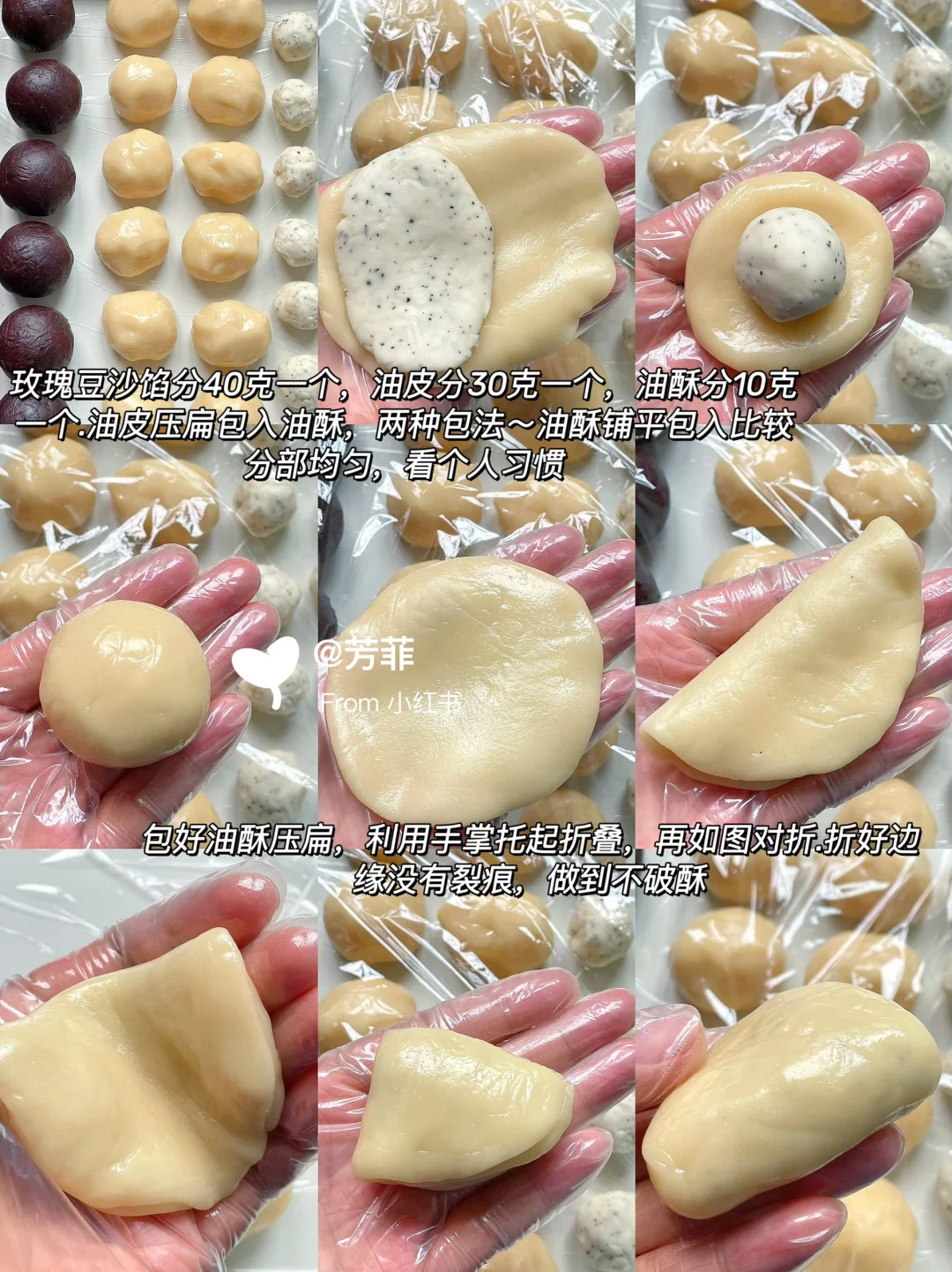 3️⃣将饼皮分成12份约30克一个,油酥分成10克一个,玫瑰豆沙馅分成40克一个.饼皮压扁包入油酥,再压扁如图手掌弯起轻轻托起对折轻压,再托起对折,力道轻柔防止裂开⚠️折叠按压都尽量轻柔,力道均匀薄厚一致