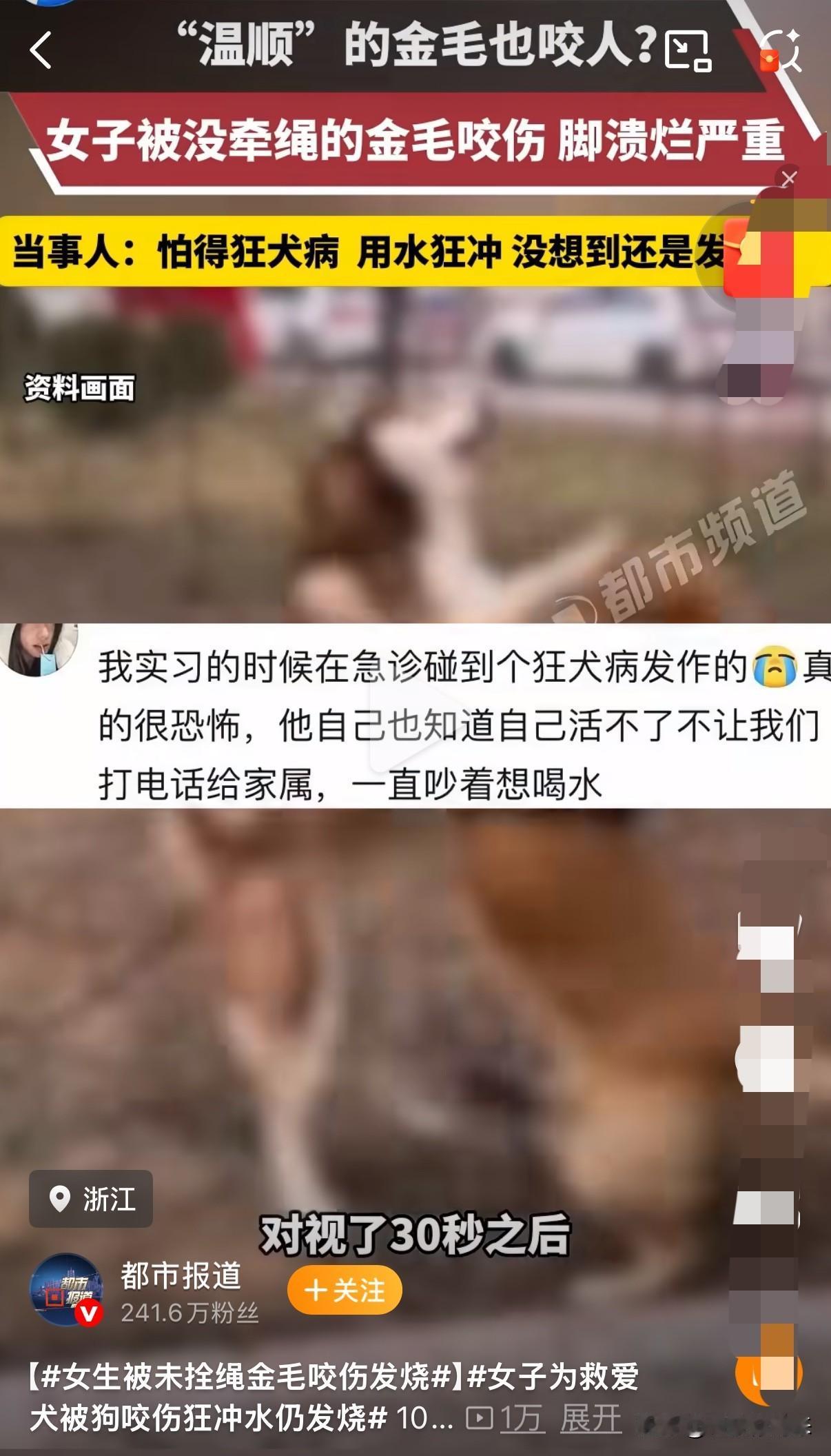 按规定拴绳养狗的人遭了殃,不栓绳的狗倒咬人了! 近日,浙江的李女士遭遇了“飞来横祸”:她取快递时看到自家拴在柱子上的狗,正在被一条未栓绳的金毛撕咬!情急之下她去救狗,却被金毛咬伤脚部,顿时鲜血直流! 李女士赶紧对伤口进行冲水处理,也打了狂犬疫苗,未曾想伤口处溃烂严重,人也高烧不退,身心严重受伤! 事情看似偶然,实则暴露了养狗管理的漏洞。金毛主人图省事不牵绳,以为金毛温顺就放松警惕,可动物一旦冲动,谁能控制?李女士的不幸遭遇正为狗主人的疏忽买了单! “规矩是安全的护身符”。遛狗拴绳不仅是法规,更是对他人安全的尊重。倘若人人都认为“我家狗不咬人”,公共空间的人身安全何来保障? 养狗不能光谈爱心,责任才是前提。对于李女士的遭遇,金毛主人脱不了干系,不但要赔偿医药费,还要面临可能的严重后果! 望所有狗主人都能引以为戒,别等自家狗狗咬伤了别人,才后悔那根松开的绳子!大家伙说是不是?