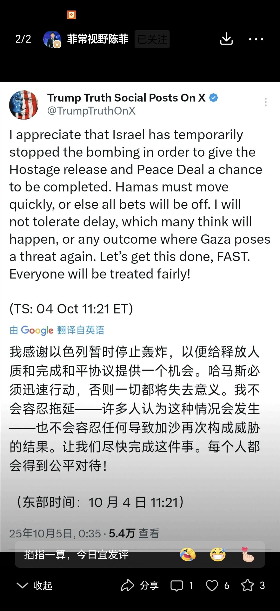 发文写道:“我感谢以色列暂时停止轰炸,以便给释放人质和完成和平协议提供一个机会。