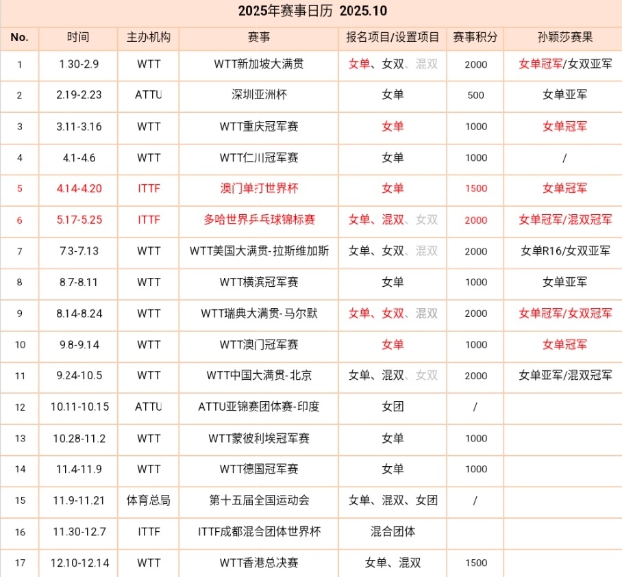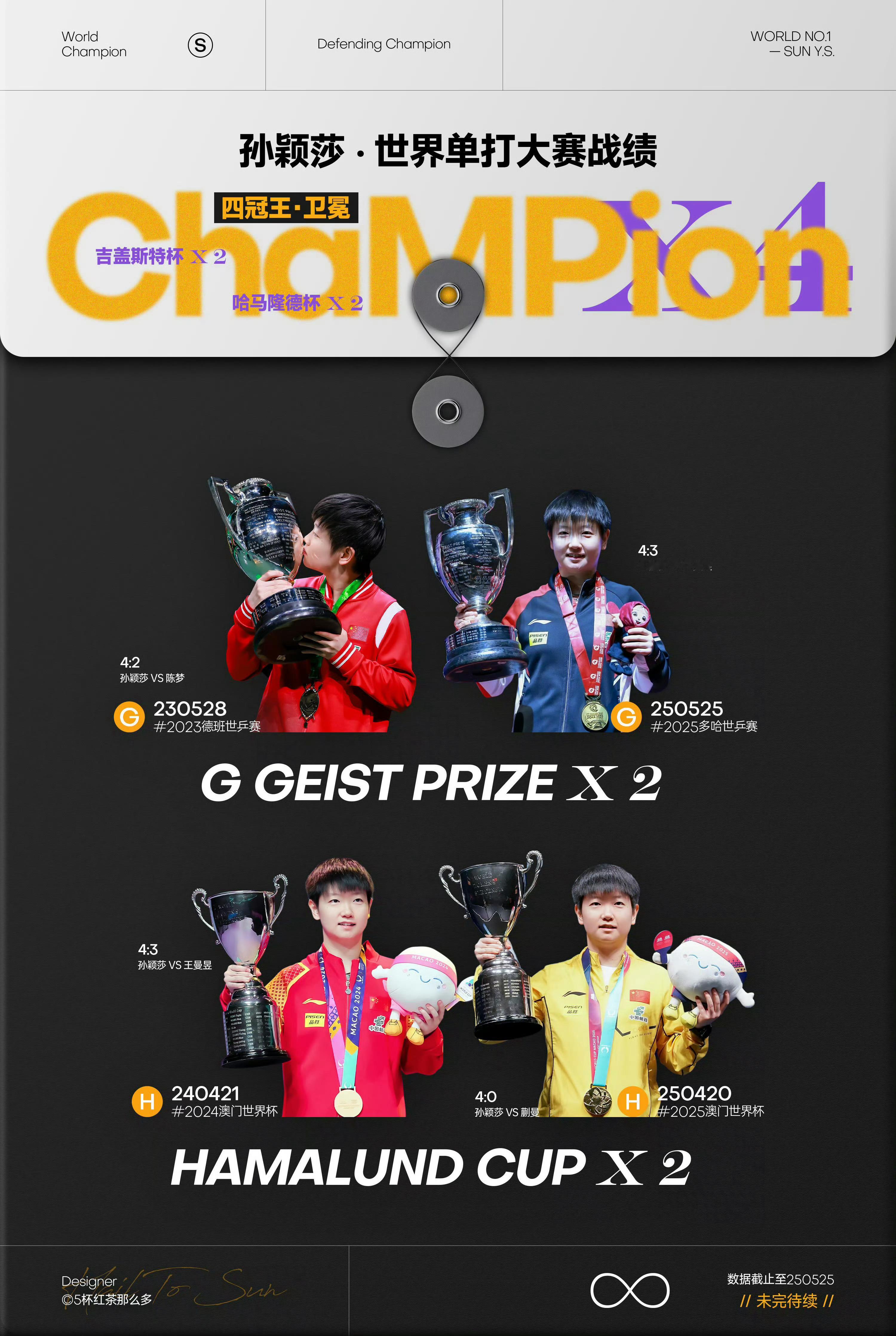 孙颖莎国际赛事单打参赛【10次】,【9次】打进决赛,收获【6冠】。包揽2025唯二三大赛单打世冠——世界杯成功卫冕、世乒赛成功卫冕达成双圈金满贯,成就首位WTT大满贯赛事单打四冠王。