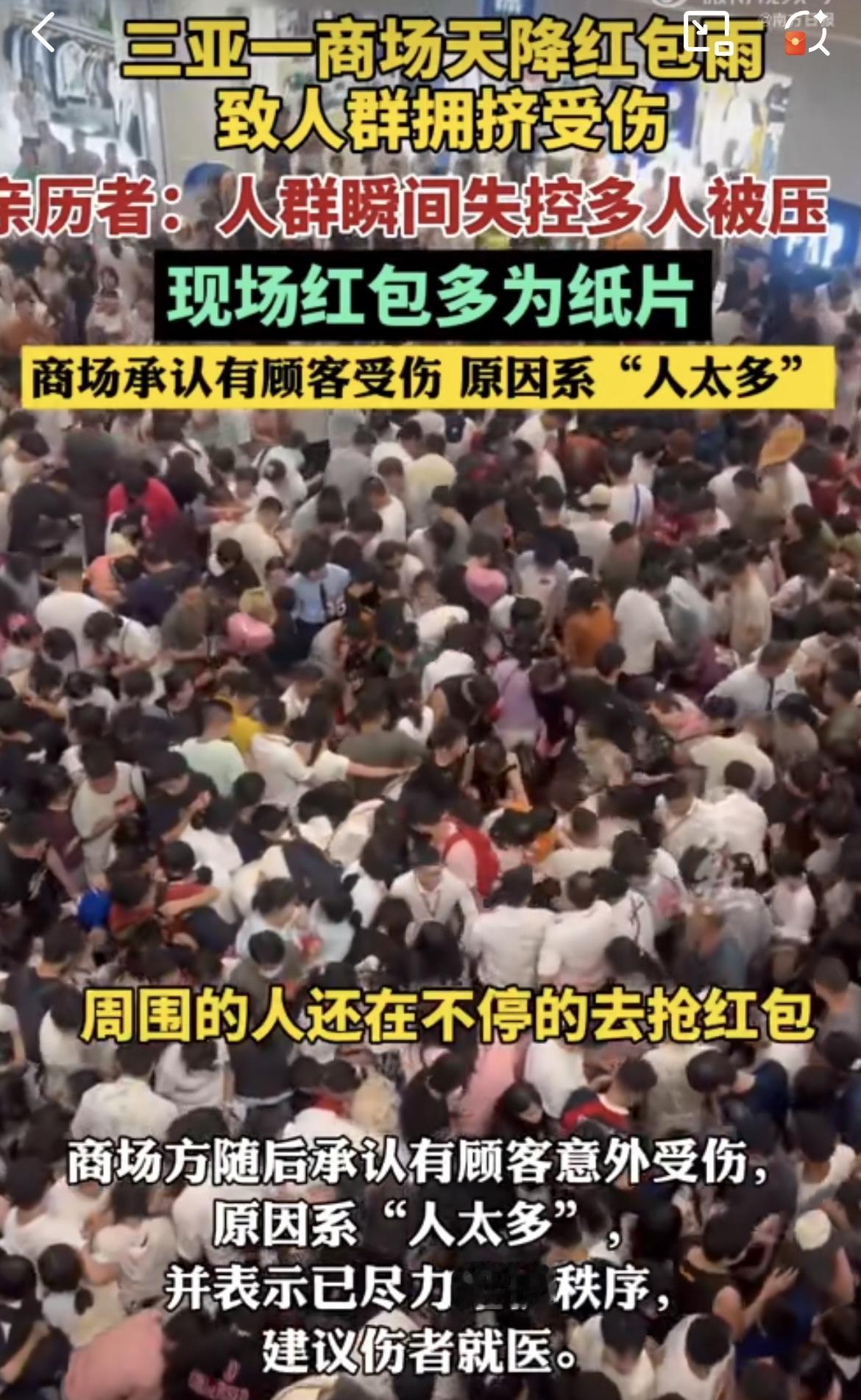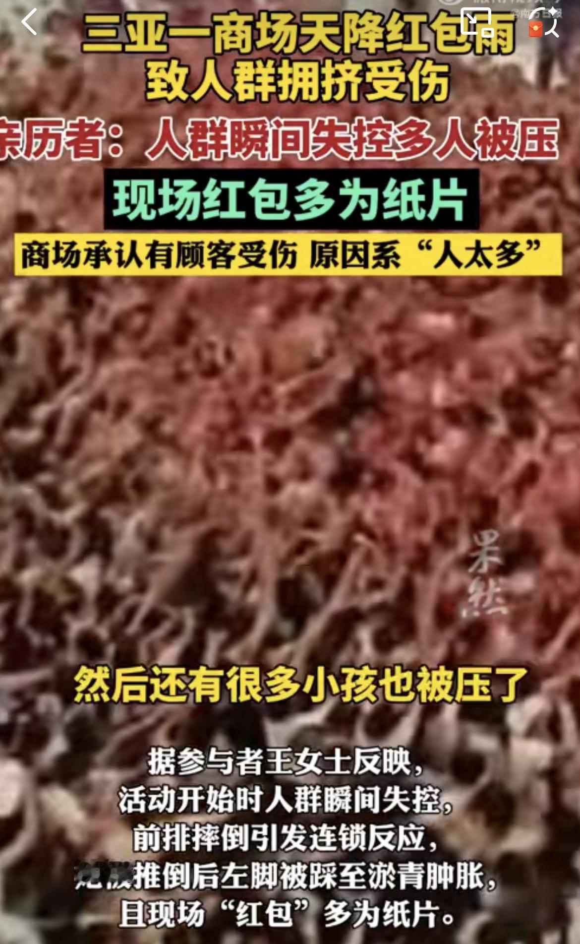 三亚一商场红包雨致人群拥挤受伤:商场要承担什么法律责任? 三亚一商场红包雨致