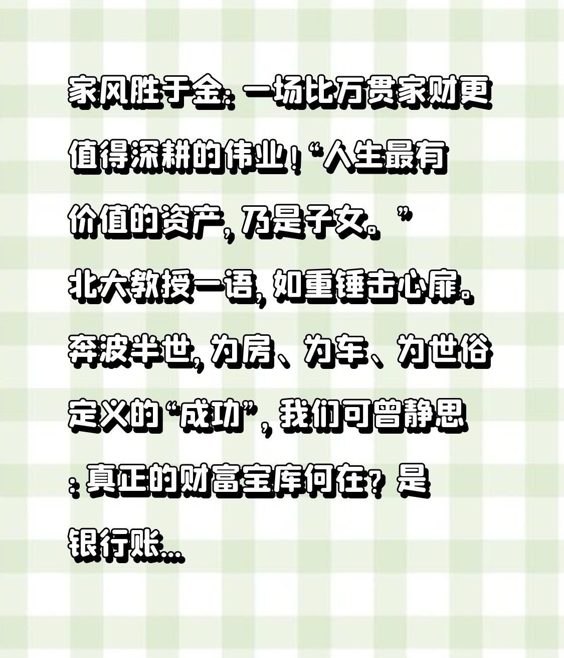 家风胜于金:一场比万贯家财更值得深耕的伟业! “人生最有价值的资产,乃是子女。” 北大教授一语,如重锤击心扉。奔波半世,为房、为车、为世俗定义的“成功”,我们可曾静思:真正的财富宝库何在?是银行账户冰冷的数字,是名下房本的厚度,还是市值浮动的报表?不,当我们望向那些站在财富之巅的身影,便赫然发现,他们心头最挂牵的,并非这些可计量的身外之物,而是血脉的延续、家业的传承——那份塑造灵魂的无形财富:家风与品德。 且看商界巨擘,王健林、马云,掌控亿万资产,富可敌国。然而,即便在商海翻云覆雨,他们最深切的忧患,早已超越了财富的积累。王健林坦言忧心忡忡的,是子孙能否真正扛起责任,传承基业又懂得感恩;马云寄望儿子的,非肆意挥霍的资本,而是金子般的善良心性。对财富的理解,他们洞穿浮华,触达了内核——真正的传承,根基不在金钱,而在支撑金钱不被倾覆的品格与精神。 那么,于我等平凡之家,“家风胜于金”又何以解读?答案澄澈明净:家风,乃一家的魂魄。它无形无相,不能存银行供估值,却远胜金银铜钿。它是沁入子孙骨血的“精神滋养”。万贯家财堆砌的不过一座沙滩城堡,若无正直、良善、勤勉的家风之基,风雨飘摇之际,顷刻便可崩塌。反之,纵使家徒四壁,只要那正直如松、良善如泉、勤勉如牛的家风长存,便能薪火相传,生生不息,这才是家族屹立不倒的铁律。 古训“财富如水,三代可败尽”,并非危言耸听。历史长卷中,多少豪门显贵,如晋朝石崇斗富,最终却因内部腐败、道德沦丧而一败涂地,富丽转眼成灰烬。反观如颜氏家族,虽无泼天富贵,却能“陋巷不改其乐”,德泽绵延数百年而不衰,靠的正是那“门风清肃”、家训严谨所塑造的坚韧“精神堡垒”。 细思之下,若你坐拥金山银矿,子孙却无品德根基、缺责任心、无自律能力,此金银终是浮云。诚如古语所警:“养不教,父之过。” 为孩子备下最优渥的物质保障固然重要,但若未能在品格塑造上倾注心力,这一切终将如同建在流沙之上,毫无价值。 更令人忧心的,是当下诸多家庭的错位投入。父母奔波于“鸡娃”,倾注资源让孩子挤进名校、争高分,却常常忽略了教育的起点——父母自身的一言一行。你口口声声教导孩子要诚实守信、有担当,自己却时常投机取巧、贪占小利。如此“言传身教”,岂非“空谷回响”?《礼记》早已点明:“身不正,虽令不从。” 父母的身教,才是孩子无可替代的鲜活教材。 孩童德行的培育,尤如春风化雨,潜移默化。你念叨千百遍“要懂得感恩”、“须有德行”,可若自身行为自私冷漠、毫无感恩之心,再好的道理于孩子而言,也只是无关痛痒的空洞说教。品德的生长,犹如《增广贤文》所感:“积钱积谷,不如积德。” 它是日常点滴言行浇灌出的精神之树,这无形的积淀,才是确保家族世代长青的真正宝藏。 或有父母焦灼:孩子尚幼,未有成就,如何与那些富足子弟相比?殊不知,决定孩子未来高度的核心,不在你当下留给他多少金钱,而在于你赋予了他何种价值底座!一个懂得感恩、心性善良、意志坚韧的孩子,纵使起于寻常,也定能走向属于自己的光明天地。 再者,家风的建造与传承,非一人之功,需全家勠力同心。父母自当以身为度,成为孩子行走世间的“标准答案”;子女亦需从心底认同家族精神,礼敬长辈,深晓养育之恩。唯此,家庭之根方能深扎沃土,汲取不息的生命养分。 当知,家风的塑造,乃滴水穿石之功,非一蹴而就。如同栽树,幼苗尚需经年风雨才成栋梁;家风之厚,亦在日复一日、一餐一饭的涵养中点滴凝聚。切莫将教育等同于“买好房”或“送名校”,真正的育人伟业,在于教会孩子顶天立地、明事理、通人情。 不妨畅想:当你血脉的延续成为了有担当、品格高尚、心存感恩之人,这份传承的价值,岂是任何数字可衡量?相较于银行账户里随时可能贬值的财富,这无形的精神资产,才是家族根脉得以延绵繁茂、代代兴隆的永恒基石! 归根结底,“以身作则”仍是不二法门。若己身不修,信用无存、责任缺失,何来立场要求子女完美?若自身懒惰散漫、无视规则,又如何寄望孩子严于律己?孩子双眼洞若观火,父母每一处言行都是最直接也最深刻的教科书。故为人父母者,当时时反躬自省,努力将自身铸成值得孩子敬仰与模仿的榜样。 概而言之,家风之重,远超金银铜板。故曰,莫只紧盯户头上的数字增减,更要用心、用情、用行去栽培那无价的精神财富——良好的家风。请自今日始,从己身做起,将家园打造成充盈正气、温暖与希望的港湾。如此,我们的子孙,方能在传承中真正握有一份远比黄金珍贵且恒久的生命厚礼。家风胜于金,毋庸置疑,这是一场远比追逐万贯家财更深刻、更值得代代奋斗的伟大传承!最好的家风 家风传统 朴实家风 家庭家风家训 家人家风