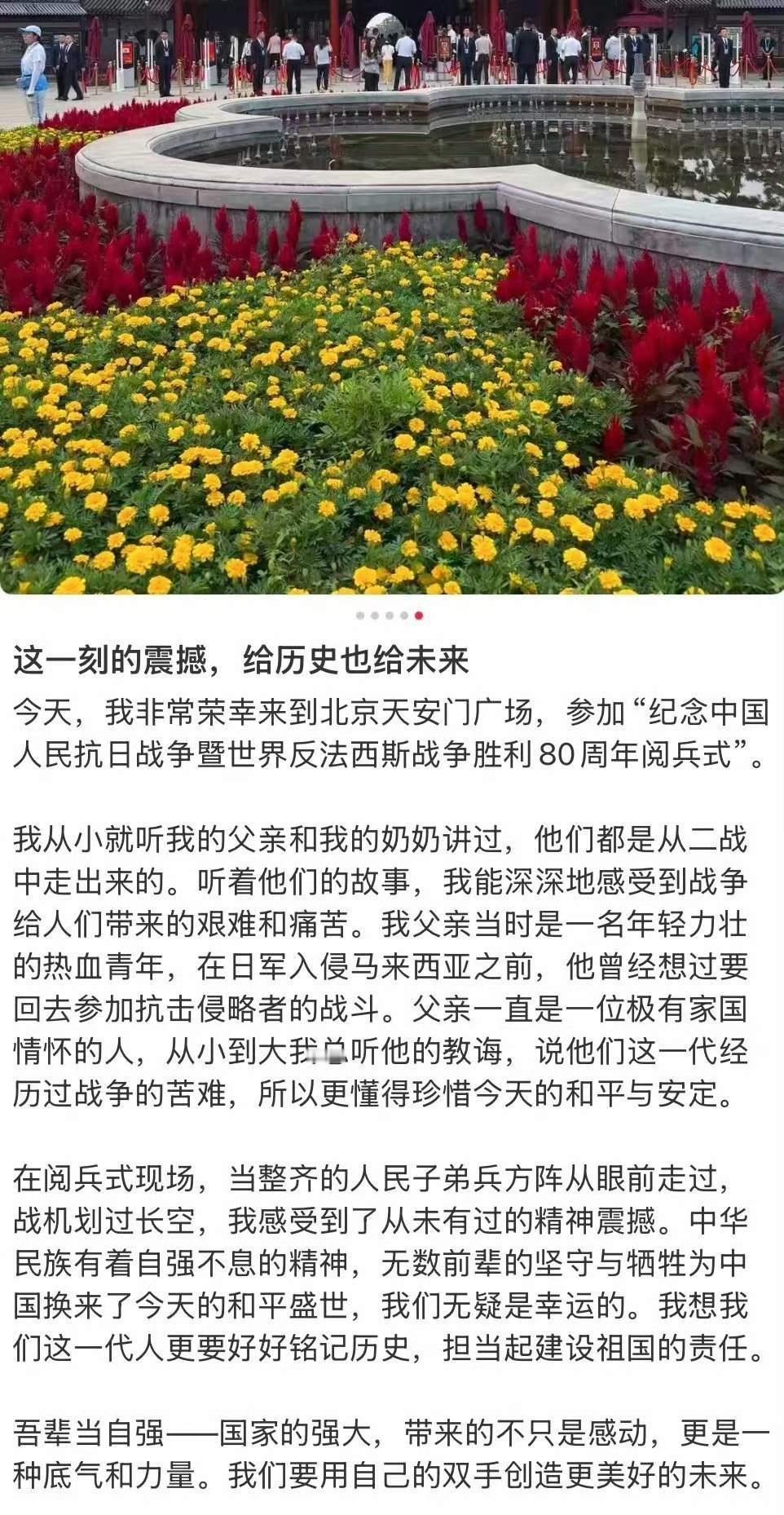 香格里拉酒店集团董事长郭惠光受邀参加九三阅兵,她特别感动和震撼。 郭惠光的父亲郭鹤年是马来西亚首富,被誉为"亚洲糖王",郭鹤年祖籍福建省福州市仓山区盖山镇郭宅村,郭鹤年,是非常爱国又为国做出过很大贡献的大马企业家,郭鹤年也是中国改革开放20多年来最重要的境外投资者之一在中国内地投资总额达50亿美元,其中最引人注目的就是坐落于北京的“中国国际贸易中心”,被认为是北京现代建筑的代表,郭氏家族拥有国贸、香格里拉酒店和金龙鱼等产业。80年代末,很多外商从华撤资,郭鹤年不但不撤资,却加大对中国的投资,成为引领海外华商乃至外商看好中国的标杆旗帜。 郭惠光在观看了阅兵后特别感动和震撼,她写了一篇“这一刻的震撼,给历史也给未来”的观后感,她表示在阅兵式现场,当整齐的人民子弟兵方阵从眼前走过,战机划过长空,她感受到了从未有过的精神震撼。她还表示其父亲一直是一位极有家国情怀的人,从小到大她总听他的教诲,说他们这一代经历过战争的苦难,所以更懂得珍惜今天的和平与安定。马来华人一直是海外华人华侨中最爱国的存在! 向大马华人华侨致敬!你们是海外华人华侨典范。強大祖国一定是你们坚强后盾。 吾辈当自强一一国家的强大,带来的不只是感动,更是一种底气和力量。我们要用自己的双手创造更美好的未来 世界华裔百分之九十五都深恋故国,最恋着故国的当数马来华裔。大马华人,华人之光,他们无论境况咋样,都心心念念地恋着故土。世世代代保持着华语生活,近两百年来代代相传。这让人不胜感慨文明的力量。 祖国是世界华夏儿女的根,大部分华人心向祖国。爱国华侨后代继续发扬光大!