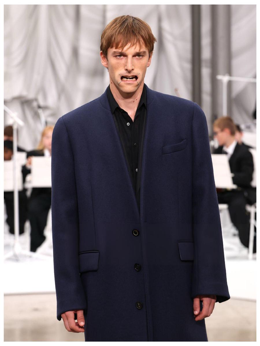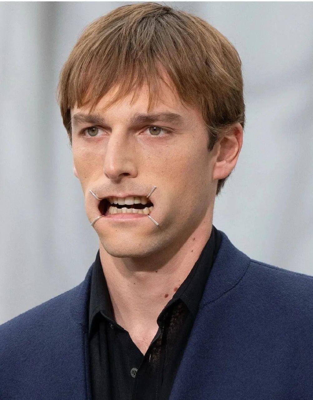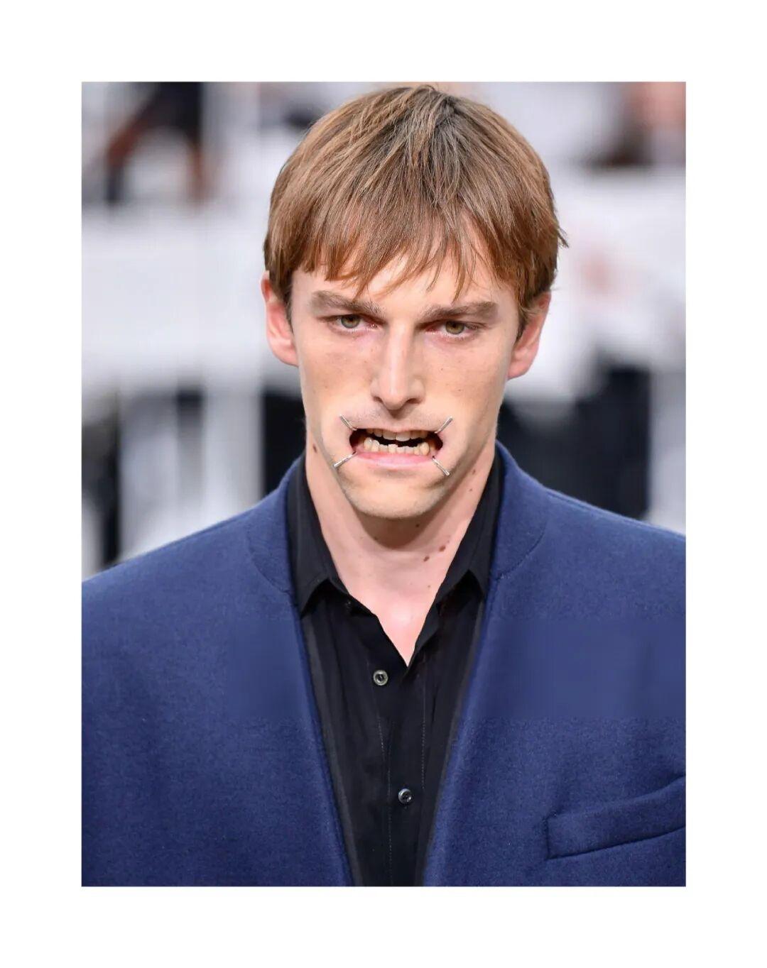 法国男模 Quentin Demeester(昆汀·德米斯特)最近重回时装周,登上了 Maison Margiela 的2026春夏成衣系列。 Maison Margiela 这一季的设计相对基础,所以设计师在模特的打扮上相对就不基础,他们让每个模特戴上了嘴部装饰,把嘴唇勾起来露出牙齿。 被评为“完美的化身”的男模特 Quentin Demeester 也因此暴露了自己唯一不完美的地方。 牙齿不整齐。