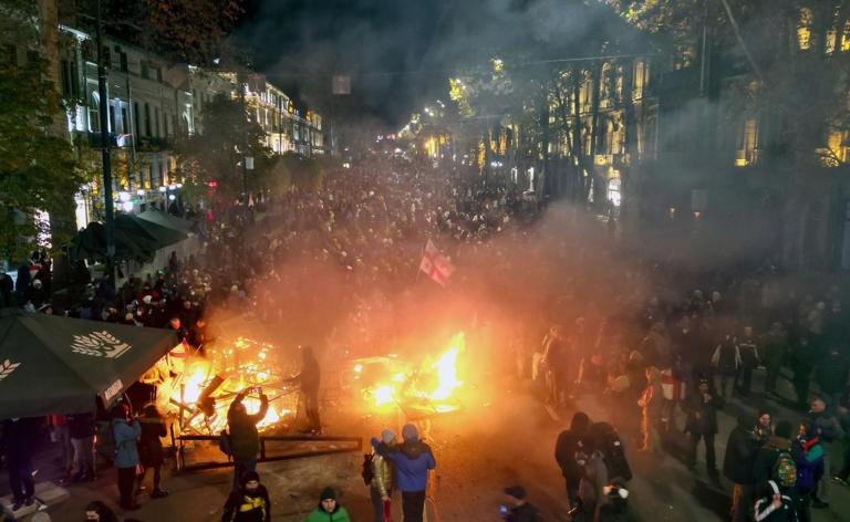 在格鲁吉亚,数十名抗议者闯入位于第比利斯市中心阿托内利街的总统府院内。 一群男子冲破围栏,袭击了几名保安人员。不久,特种部队和巡逻警察数百人赶来,对示威者发射了催泪瓦斯。 参与袭击的抗议者中有装备精良的男子,其中一些穿着防弹背心。然而,格鲁吉亚的安全部队将抗议者驱离了总统府。目前当地局势相对平静。 不过,又有数百人从自由广场游行到阿托内利街,要求进入总统府。 格鲁吉亚各地正在举行地方选举。格鲁吉亚的8个反对党7月份的时候曾经宣布拒绝参加此次选举。 去年11月,格鲁吉亚总理科巴希泽表示,格鲁吉亚将退出加入欧盟的谈判,并且拒绝欧盟财政援助直到2028年。