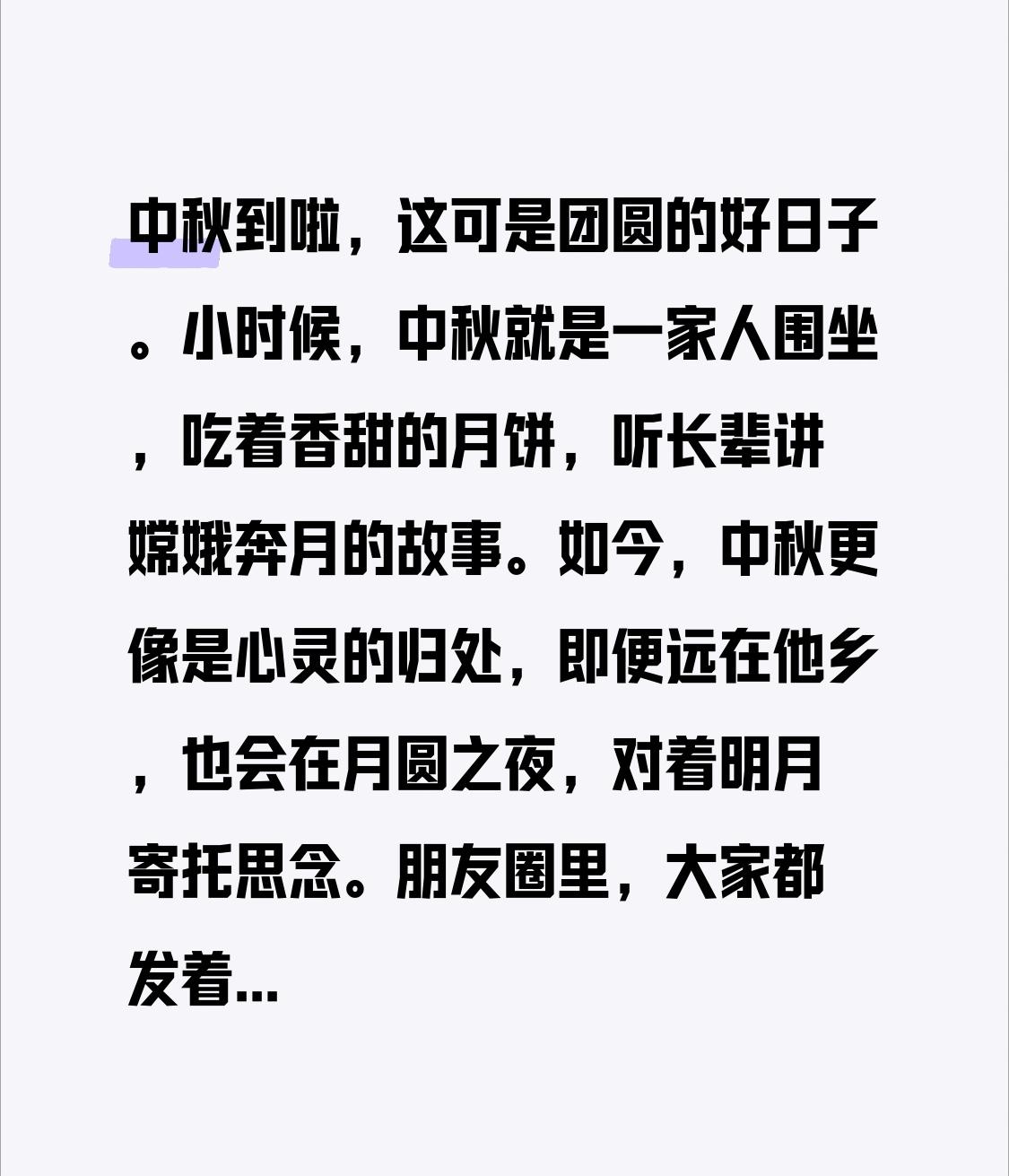中秋到啦,这可是团圆的好日子。小时候,中秋就是一家人围坐,吃着香甜的月饼,听长辈讲嫦娥奔月的故事。如今,中秋更像是心灵的归处,即便远在他乡,也会在月圆之夜,对着明月寄托思念。 朋友圈里,大家都发着走心的祝福语,“月亮慢慢变圆,事事慢慢如愿”,多美好的期盼。中秋文案也很应景,“月满中秋夜,团圆正当时”,短短几句,道尽了节日的温馨。中秋,就是要和家人在一起,共享这份岁月静好。