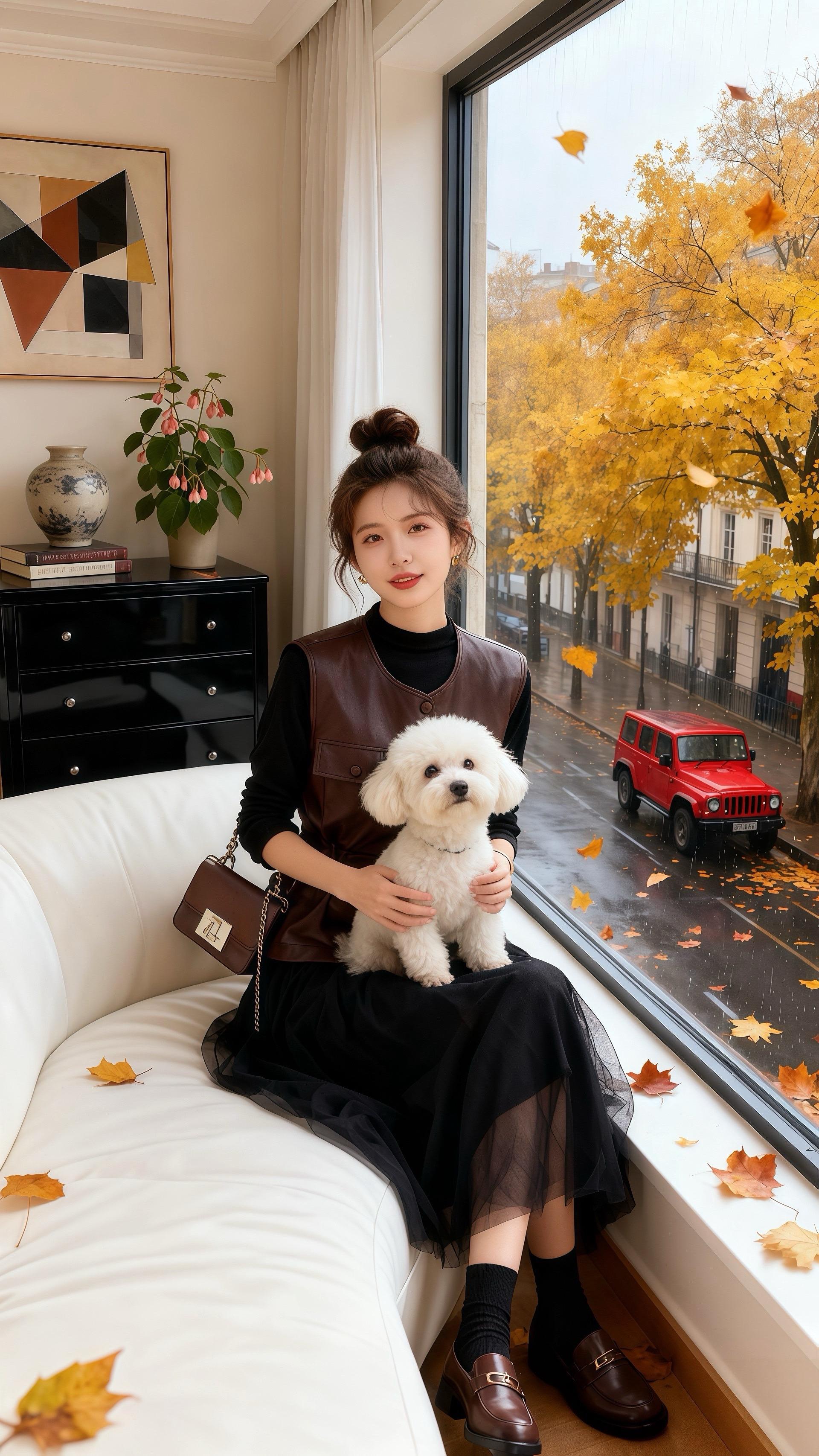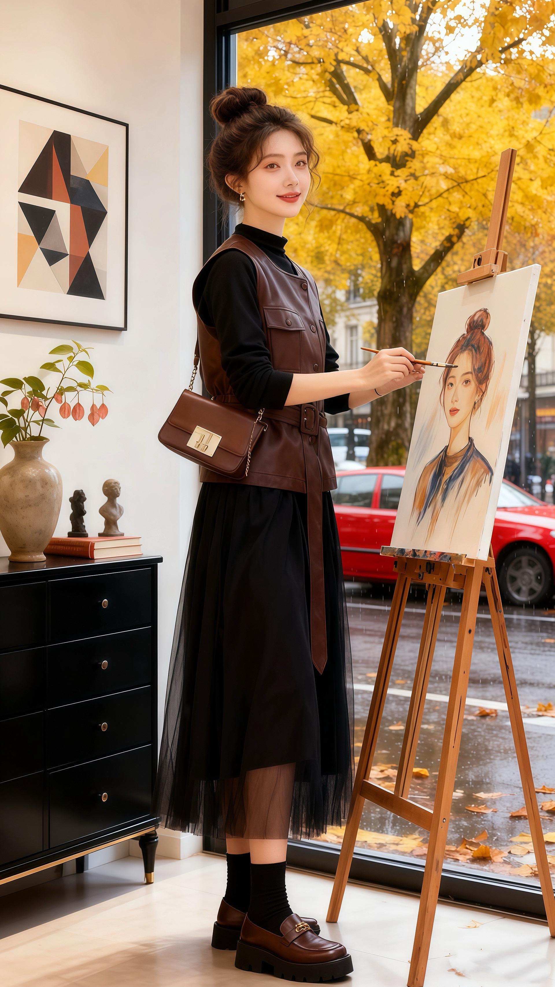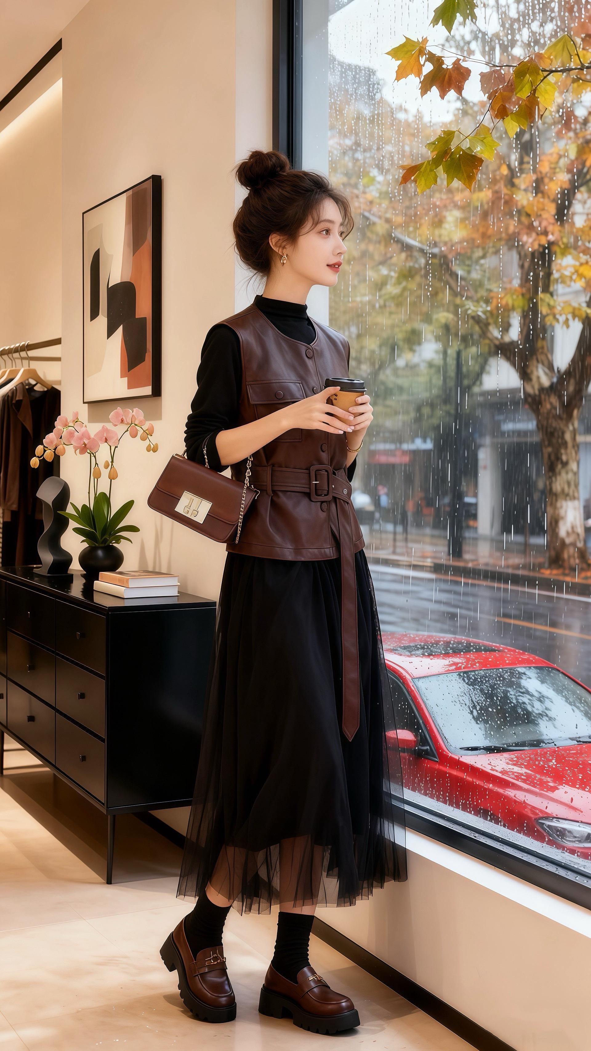 雨丝把梧桐叶洗成透亮的金,许妍抱着温热的咖啡,指尖蹭过皮马甲的纹路——深棕像熬到恰好的焦糖,把她衬得皮肤更白。