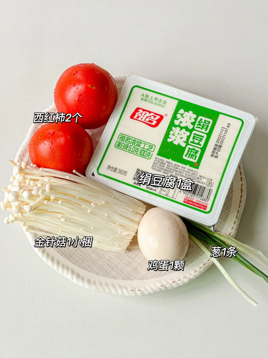 番茄2个 绢豆腐一盒 金针菇一小捆 鸡蛋1颗 葱
