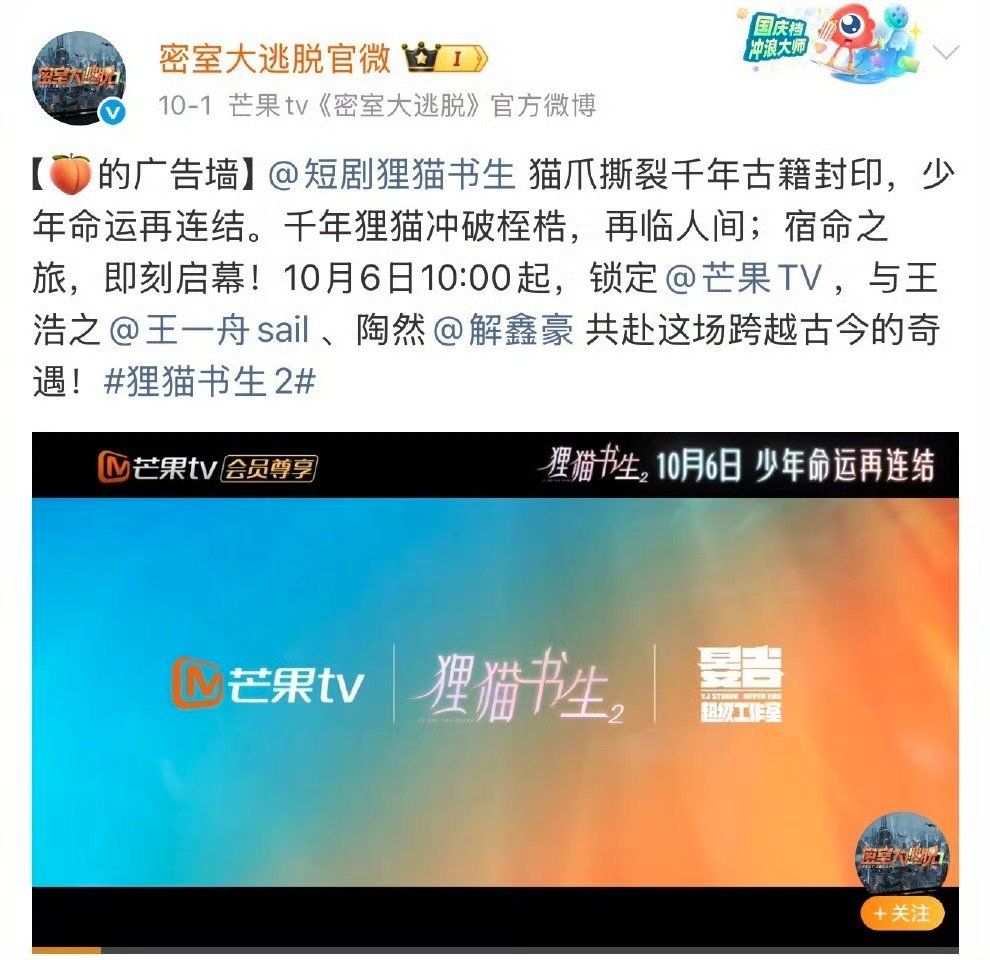 密逃导演真的很疼观众 从狸猫第一季BE到《狸猫书生2》开播,全程节奏快到惊喜!2月播完、5月官宣、7月开拍、8月杀青,导演组精准接住观众诉求,这份宠粉行动力太圈好感。 ​​​